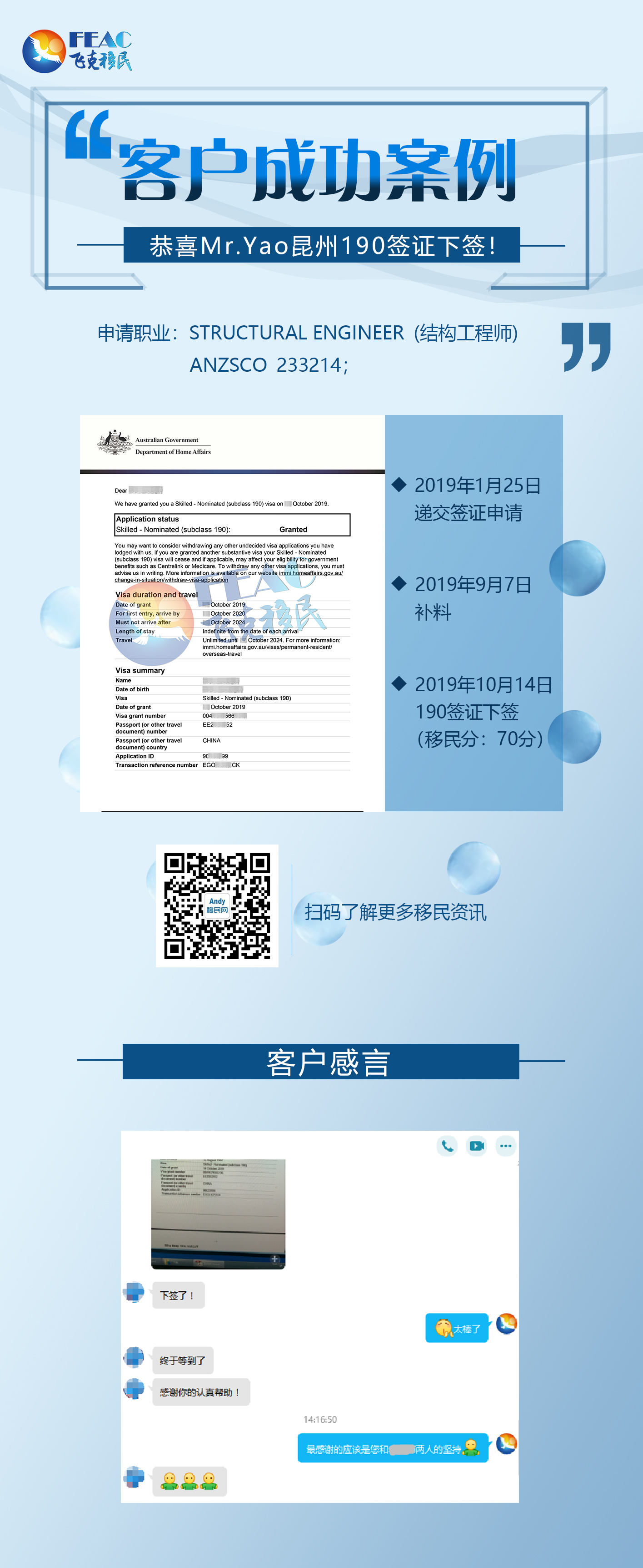 10月14日:恭喜Mr.Yao昆州190簽證下簽 (結構工程師)!