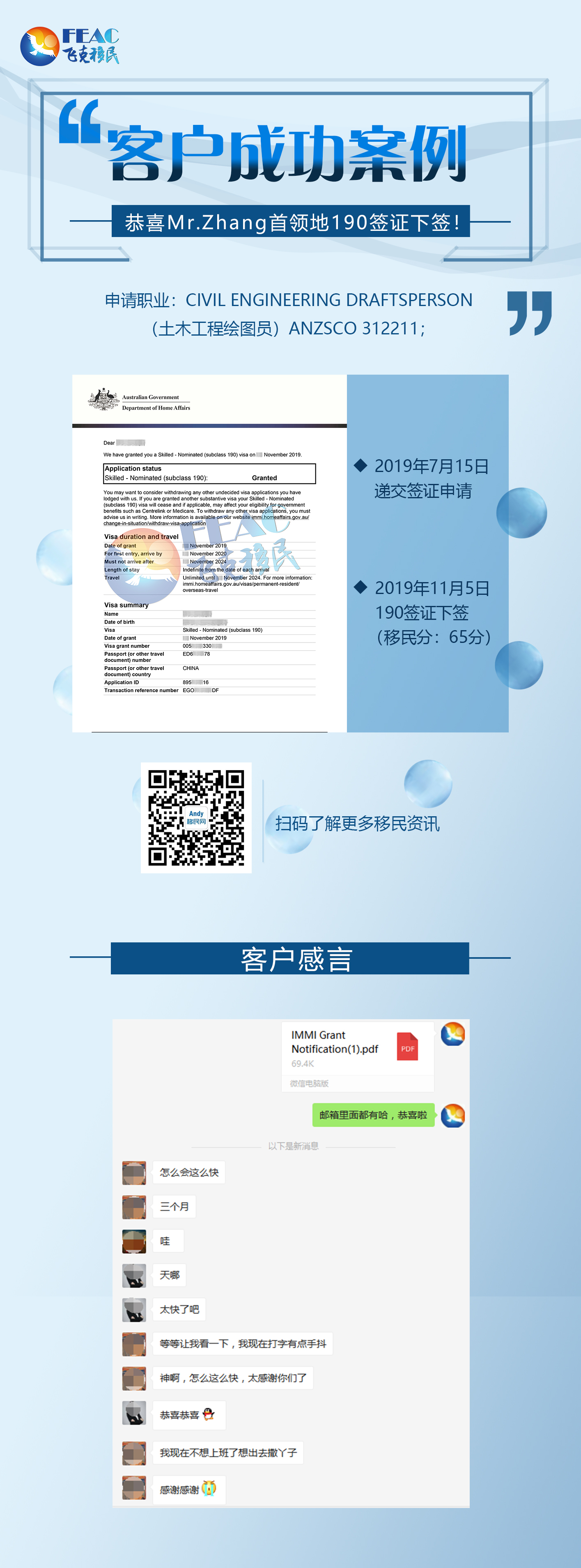 11月5日:恭喜Mr.Zhang首領地190簽證下簽 (土木工程繪圖員)!