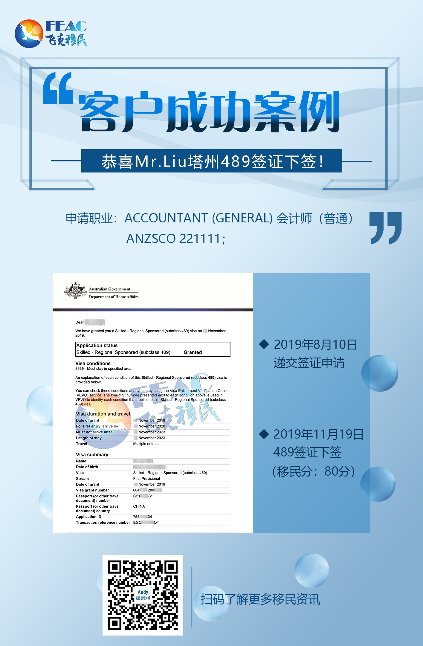 2019年8月10日遞交簽證申請,2019年11月19日489簽證下簽。(移民分80分:EOI基礎(chǔ)分70分+州擔(dān)保10分)