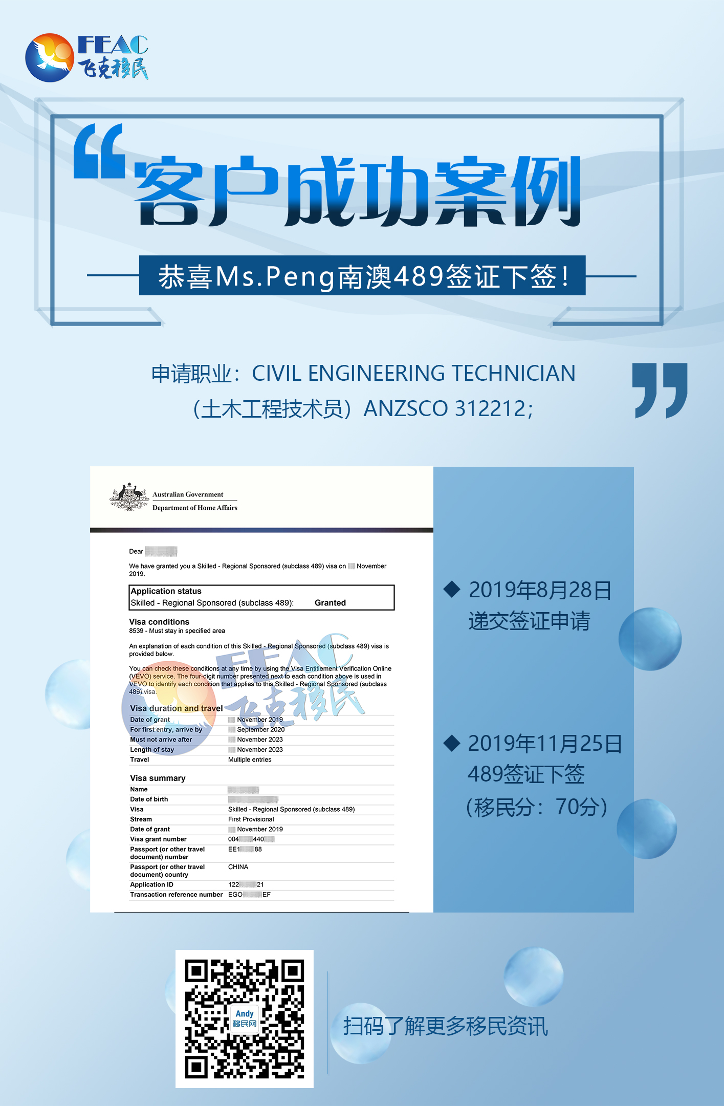 11月25日:恭喜Ms.Peng南澳489簽證下簽 (土木工程技術員)!