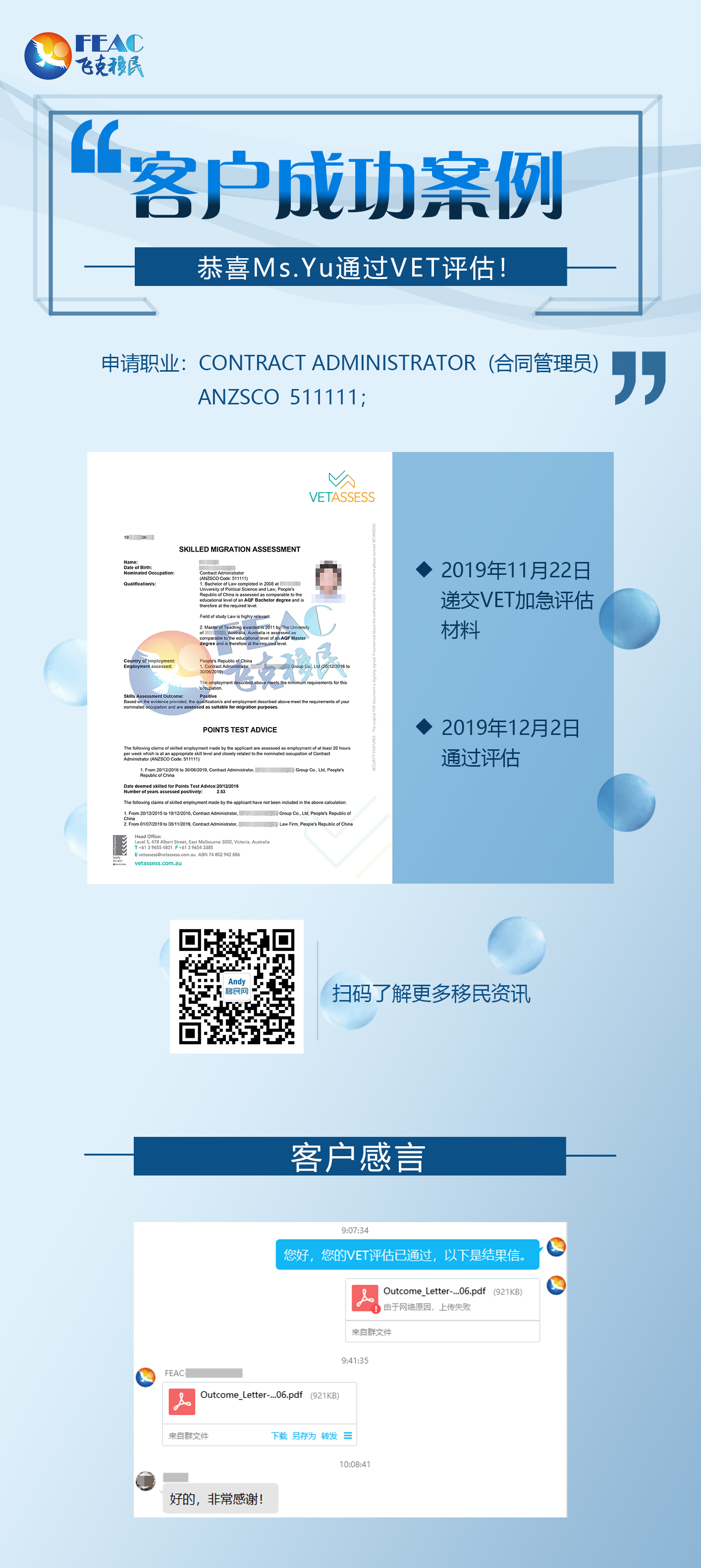 2019年11月22日遞交VET評估材料,2019年12月2日通過評估。