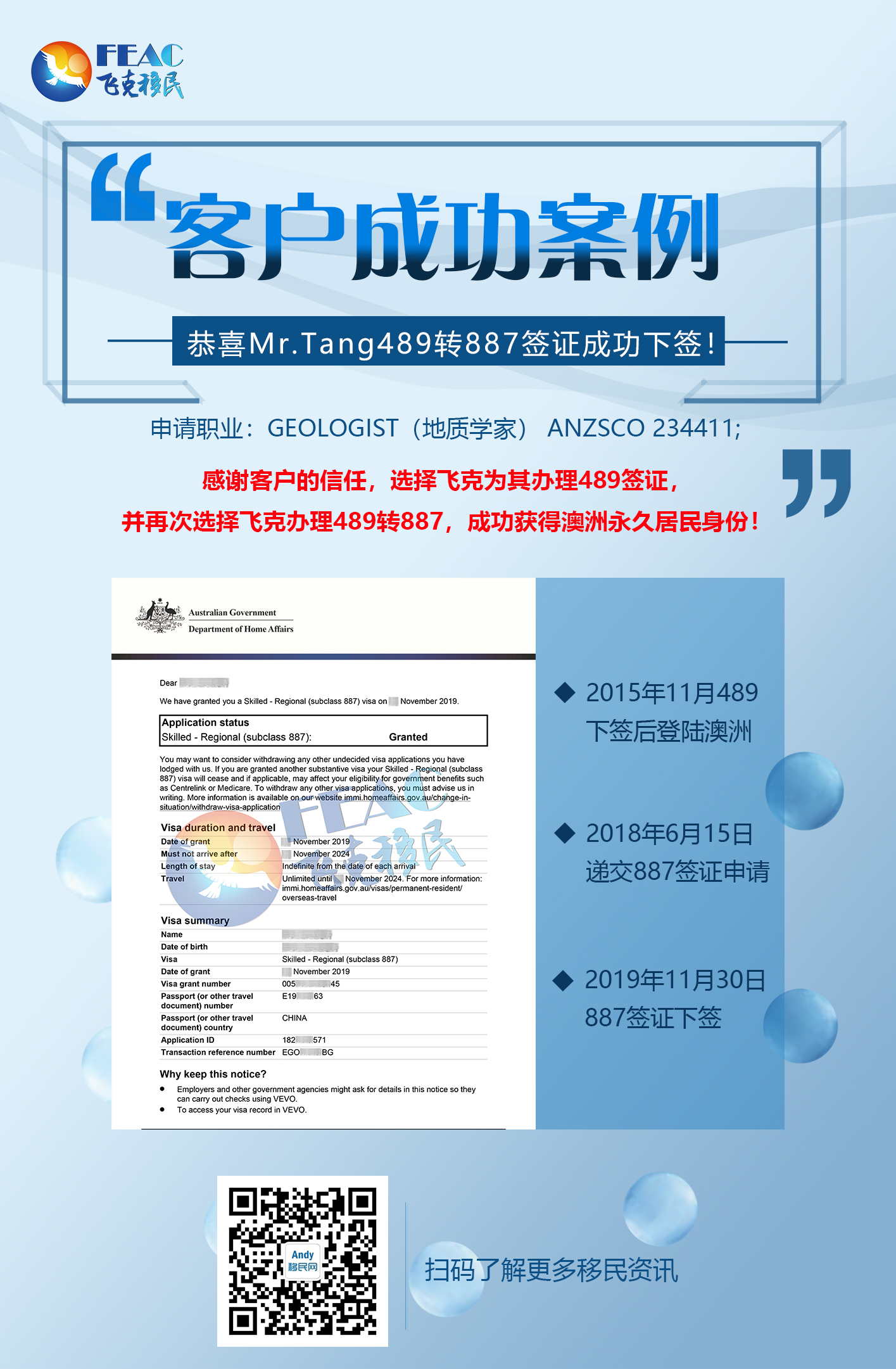 11月30日:恭喜Mr.Tang489轉887簽證成功下簽 (地質學家)!