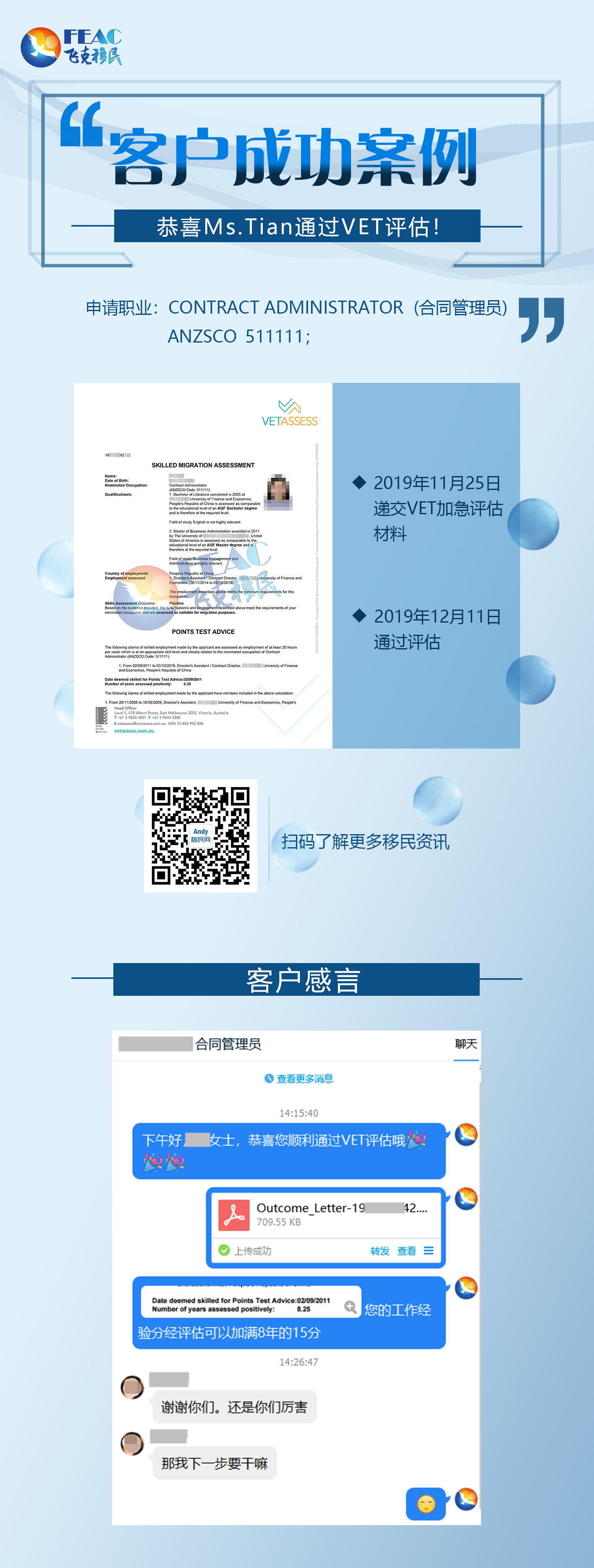 2019年11月25日遞交VET評估材料,2019年12月11日通過評估。