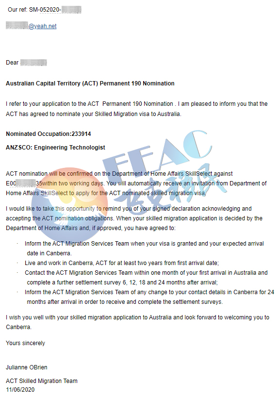 2019年12月22日遞交ACT Matrix打分(65分),2020年5月21日獲得ACT 190郵件邀請,2020年6月2日遞交州擔保申請材料,2020年6月11日獲得ACT 190擔保并EOI獲邀。