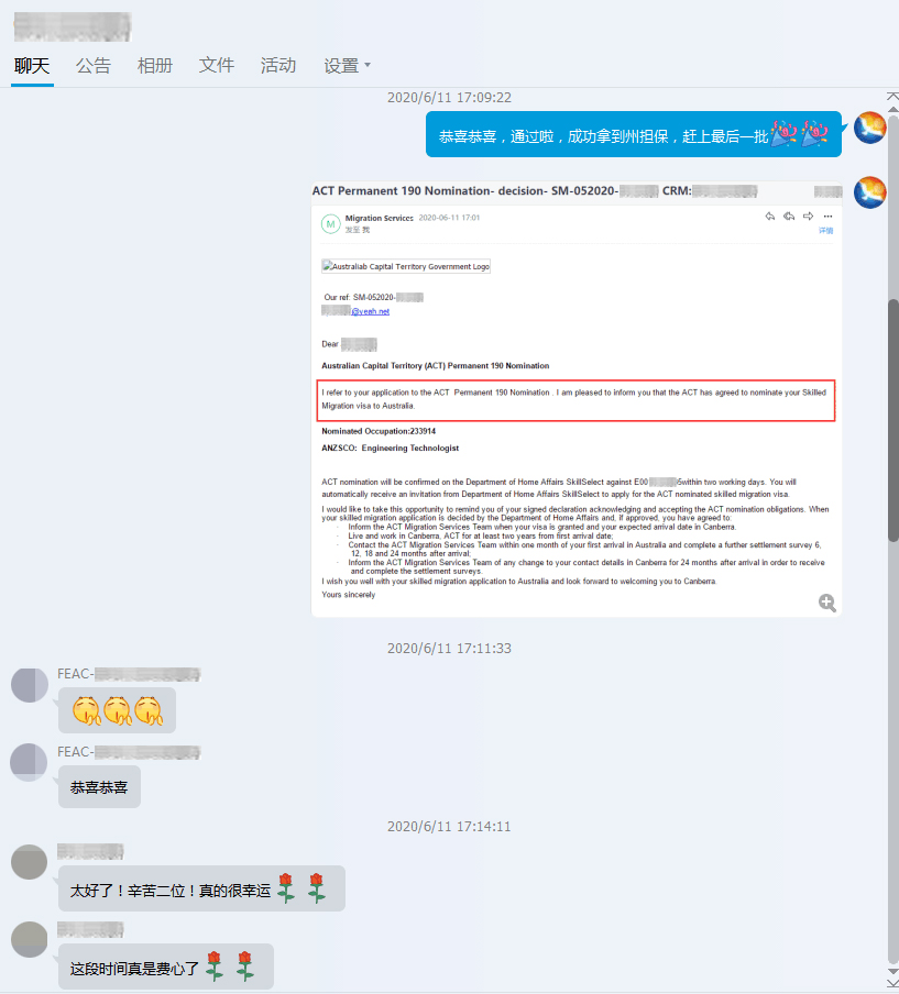6月11日:恭喜Mr.Qian獲得首領地190擔保并EOI獲邀(工程技師)!