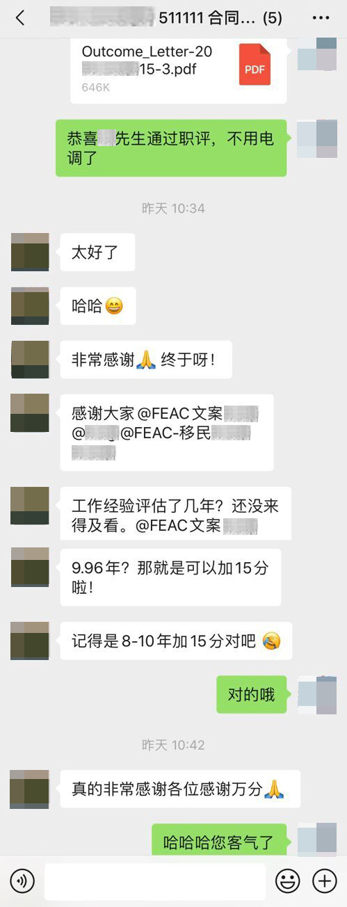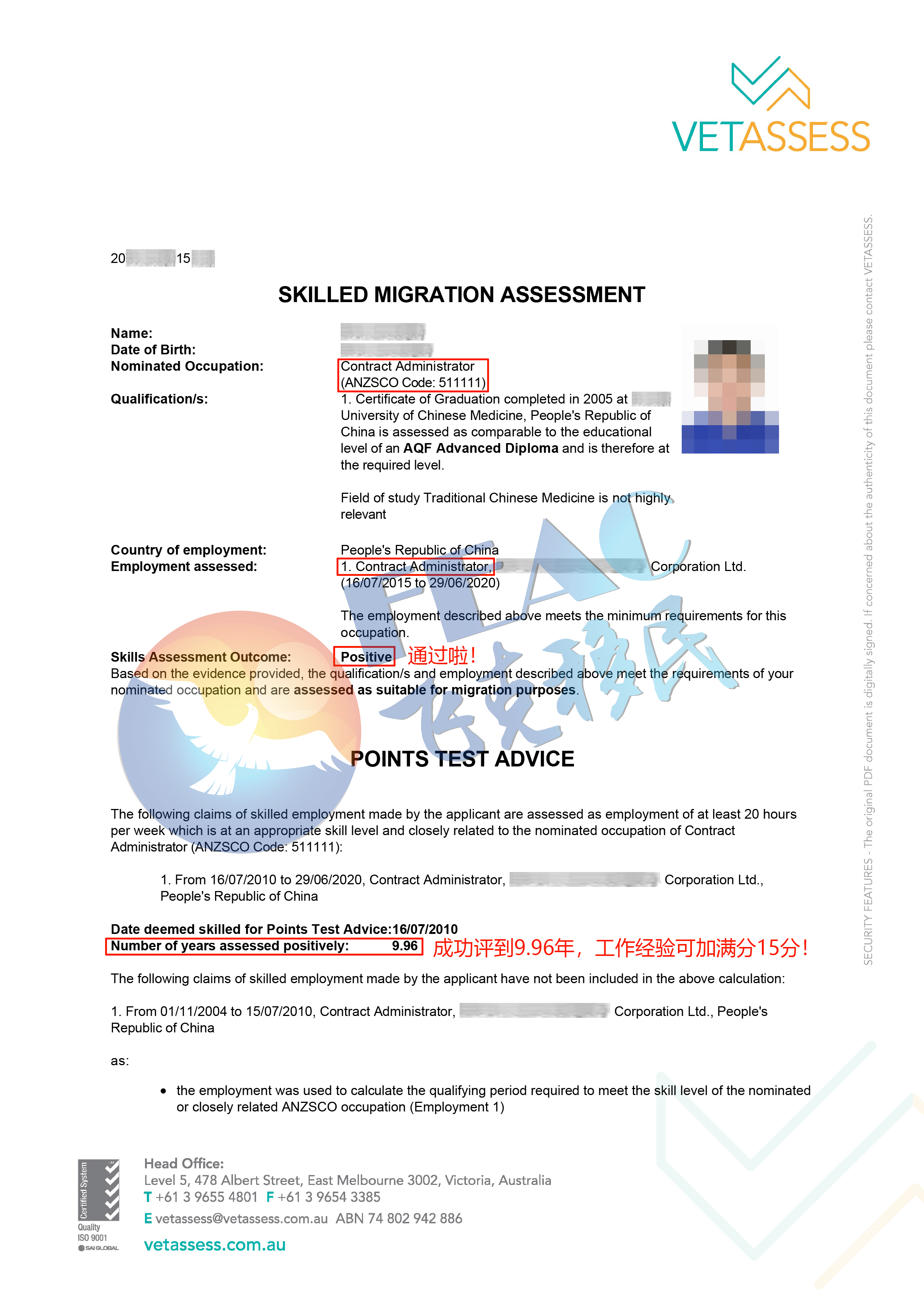 客戶本身專業(中醫)與所評職業不相關,但工作經驗與所評職業高度相關。飛克文案細心準備工作證明和推薦信等材料,最終客戶的VET評估輕松通過,并評估到9.96年有效工作經驗可為客戶的技術移民申請加15分!