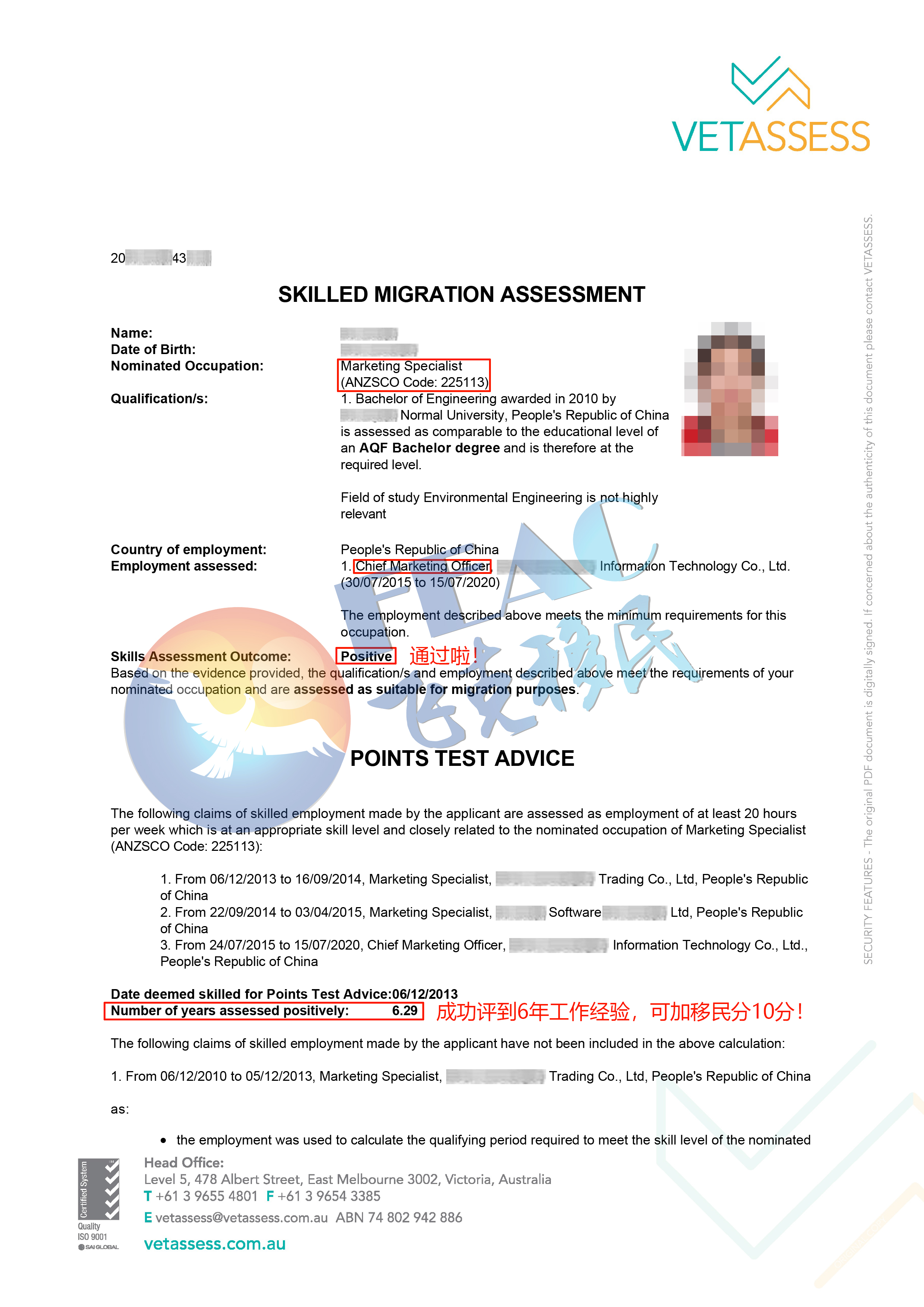 客戶是全日制本科環(huán)境工程學士學位,學歷背景和與所評職業(yè)不相關,但好在客戶工作年限較長且?guī)锥喂ぷ鹘?jīng)驗與所評職業(yè)都高度相關。經(jīng)過飛克文案仔細梳理,細心做好每一份材料,避免被VET認為不相關而多扣減年限。最終客戶的VET評估順利通過并評到6年有效工作經(jīng)驗可為后續(xù)技術移民申請加10分!