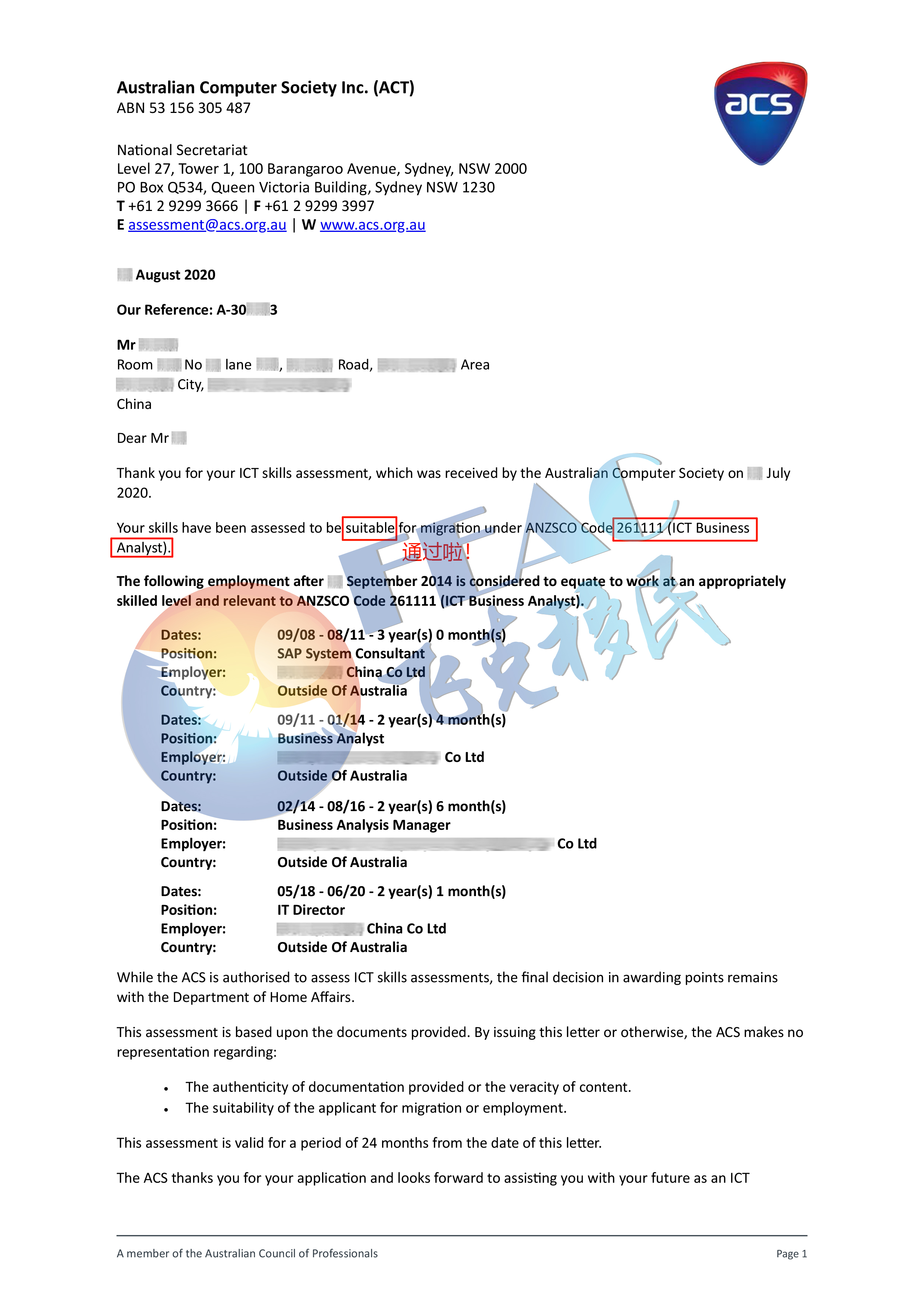 客戶本碩均非計算機相關專業,但有十多年的ICT業務分析師相關工作經驗,符合ACS評估RPL類別申請。RPL報告和工作材料為評估重點。飛克文案憑借多年的經驗和細致的準備,最終客戶的ACS評估無補料順利通過啦~