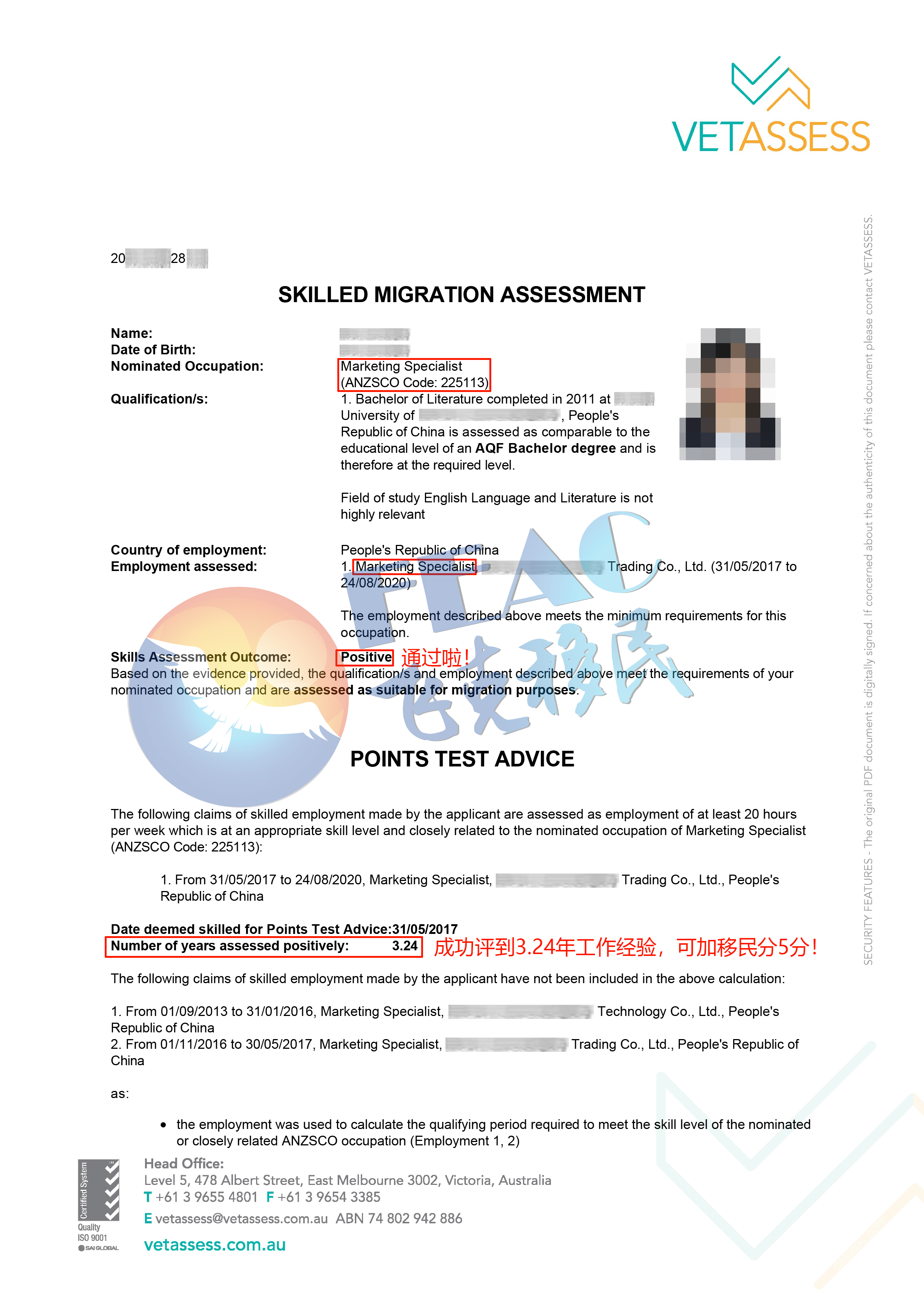 這個案子的難點有2點:①是客戶第一段工作無法提供有效的工資證明文件,飛克文案為客戶精心制作了中英對照的工資單;②是客戶的第二段工作公司員工較少,公司組織結構圖規模較小,文案精選并修飾材料,提煉出客戶公司內部組織架構,以符合市場營銷專員的評估要求。最后材料都審核校對無誤后提交,并針對可能電話調查的問題做了模擬電調。在文案的全面準備和客戶的積極配合下,最終審核官對材料非常滿意,沒有進行電調,客戶順利通過VET評估,飛克移民幫助客戶拿到5分的加分工作年限。