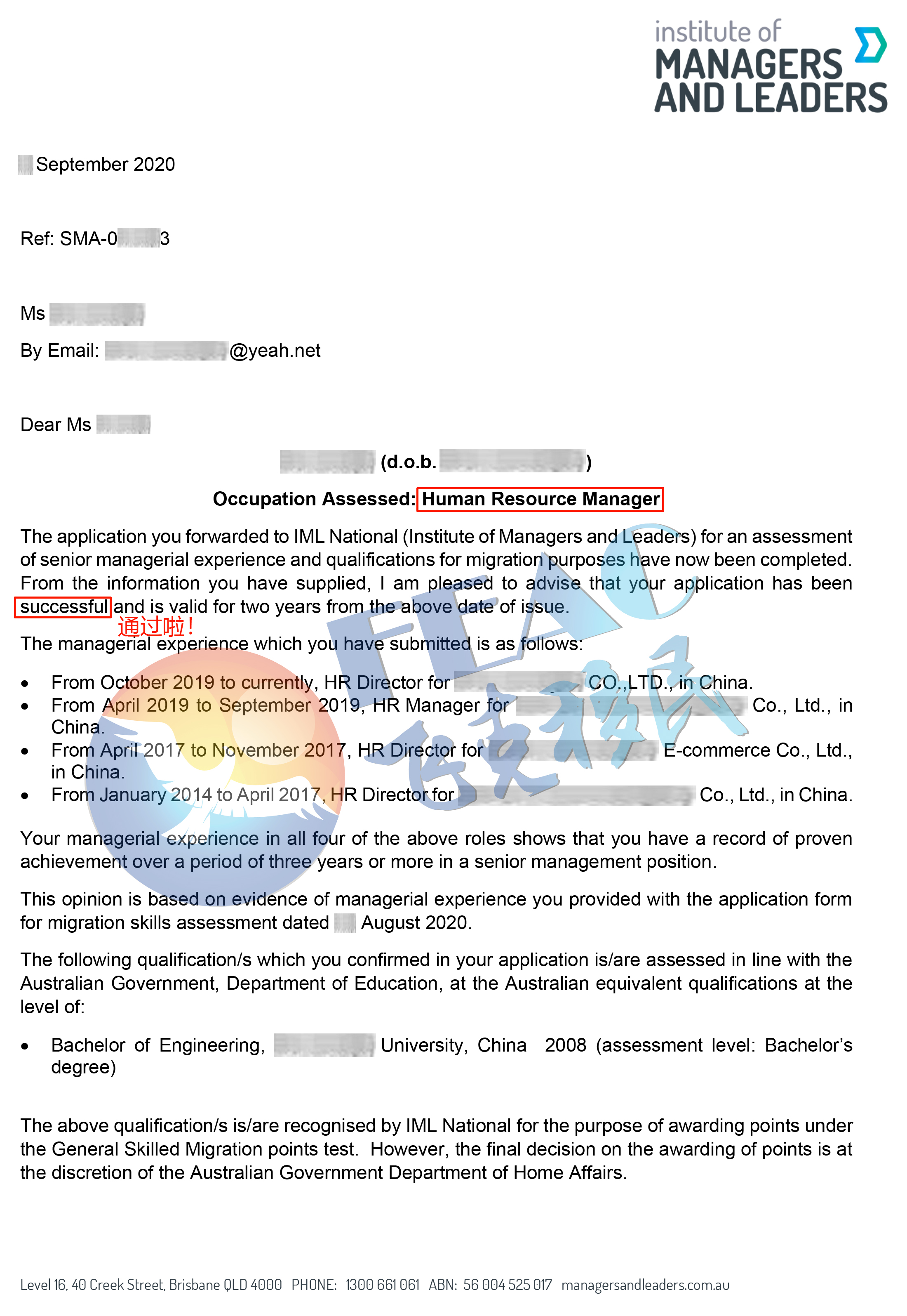 申請職業:Human Resource Manager?(人力資源經理)?ANZSCO 132311;