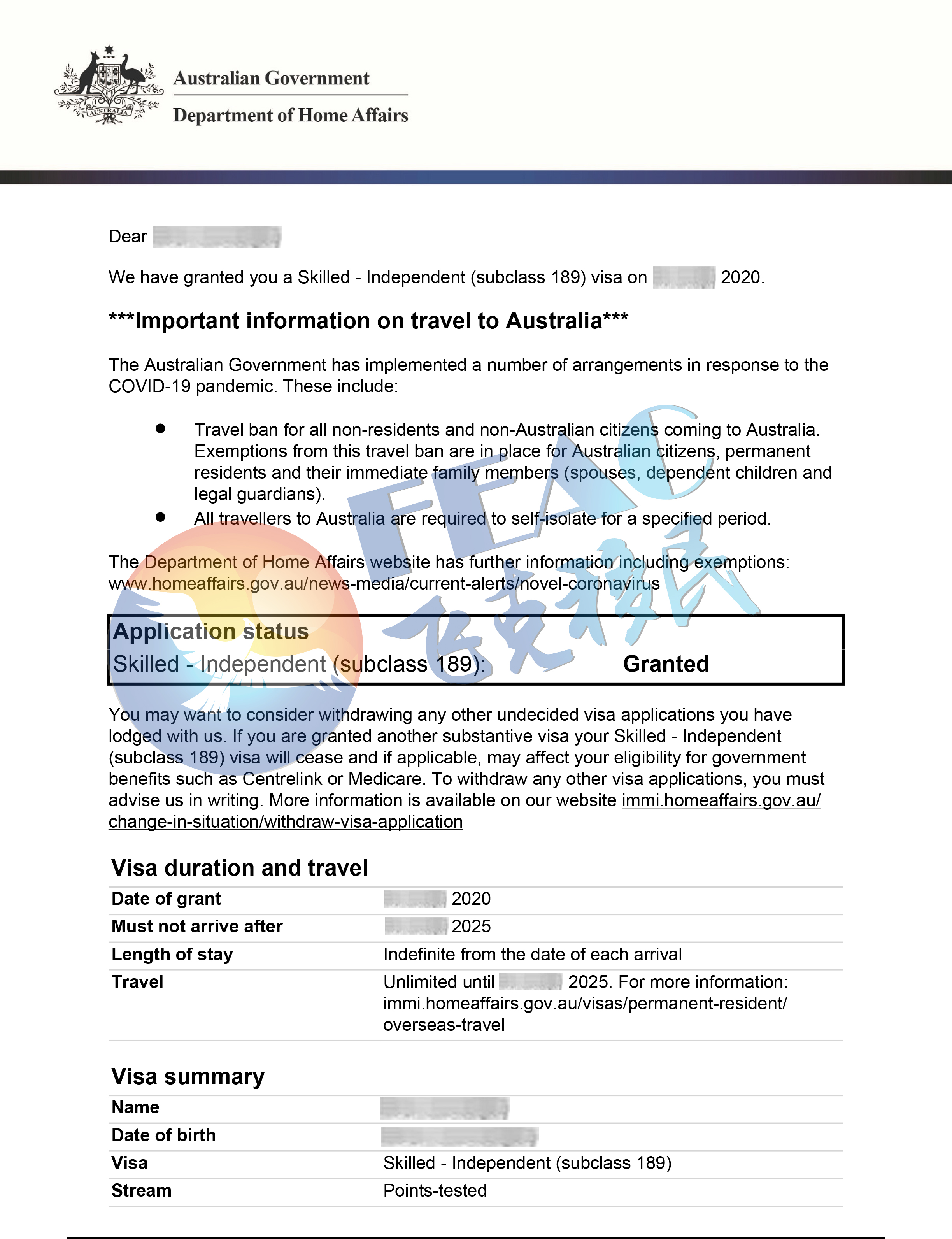 2019年6月29日澳洲境內遞交簽證申請,2020年5月6日補料,2020年9月8日189簽證下簽。