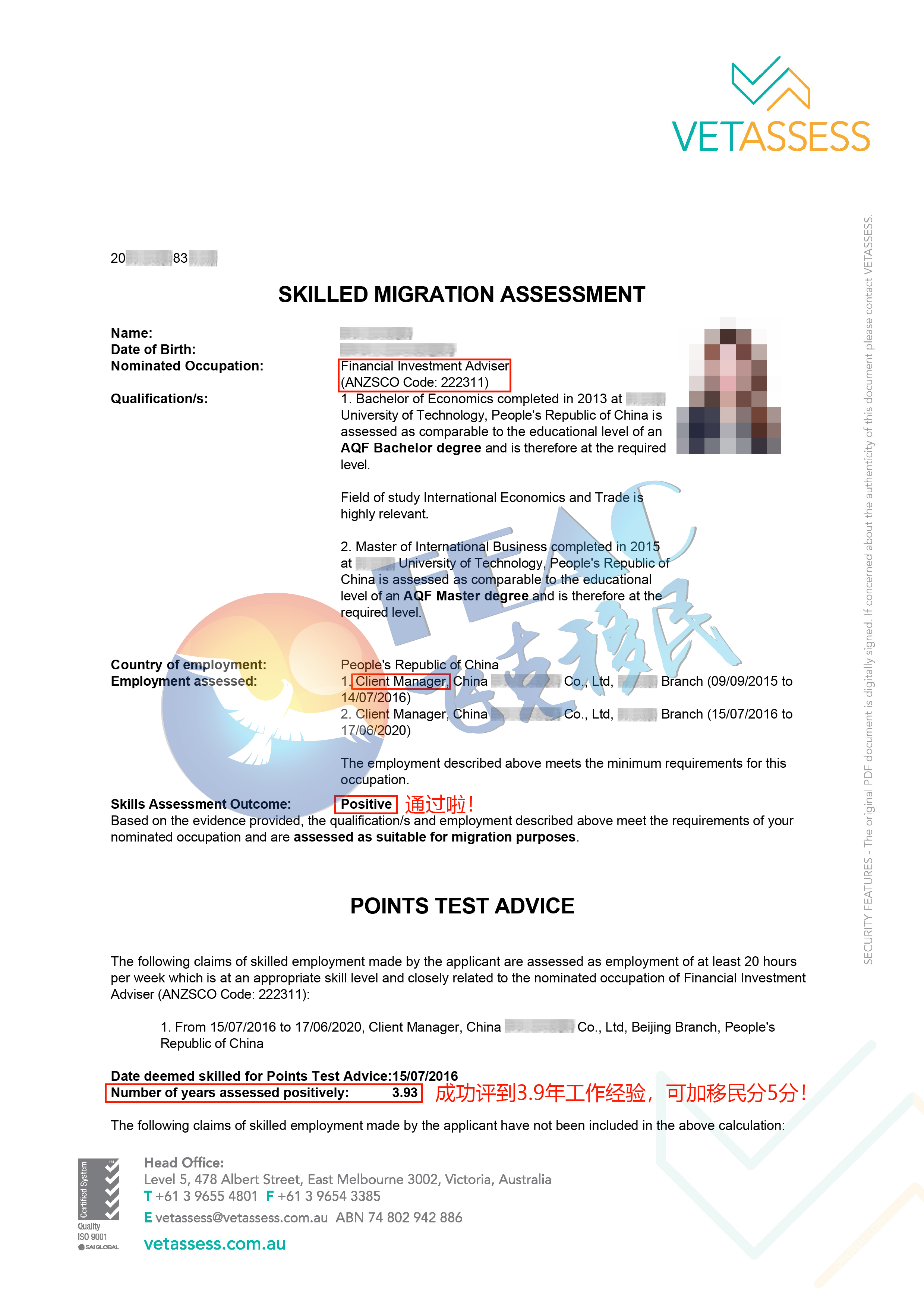 申請職業:Financial Investment Adviser?(金融投資顧問) ANZSCO?222311;