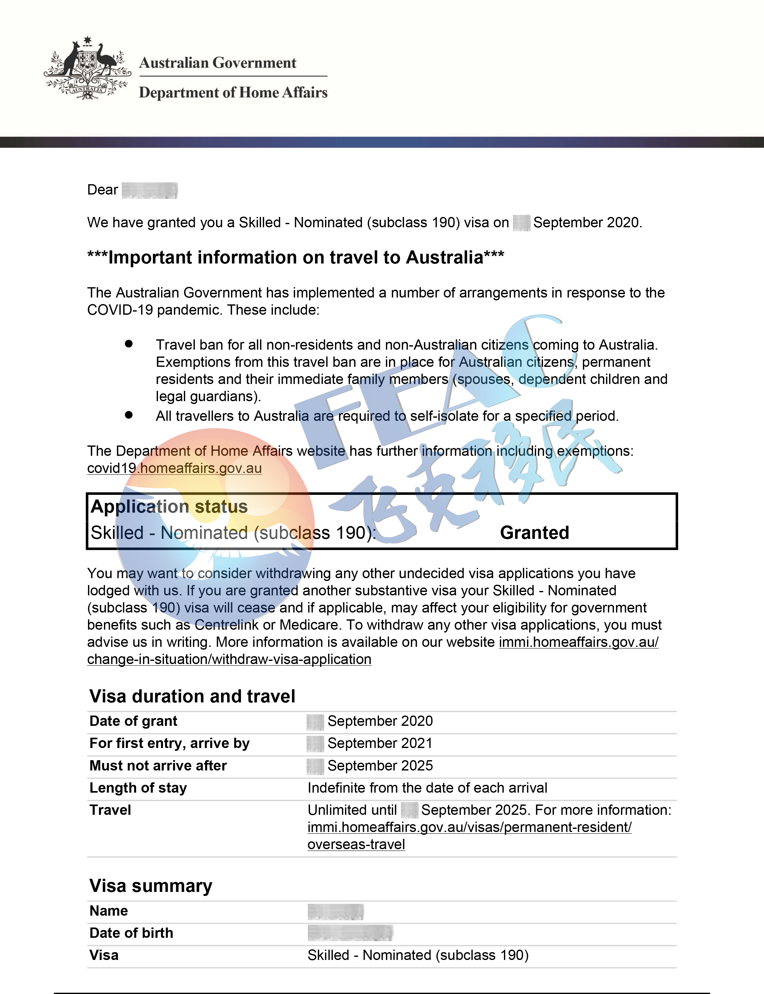 2019年11月25日遞交昆州190 EOI,2020年1月27日獲得190擔保邀請,2020年2月2日遞交州擔保申請材料,2020年2月6日獲得190擔保并EOI獲邀。2020年3月1日澳洲境外遞交190簽證申請,2020年9月23日190簽證下簽。(移民分80分:EOI基礎分75分+州擔保5分)