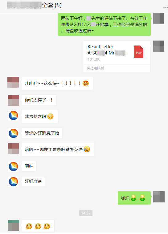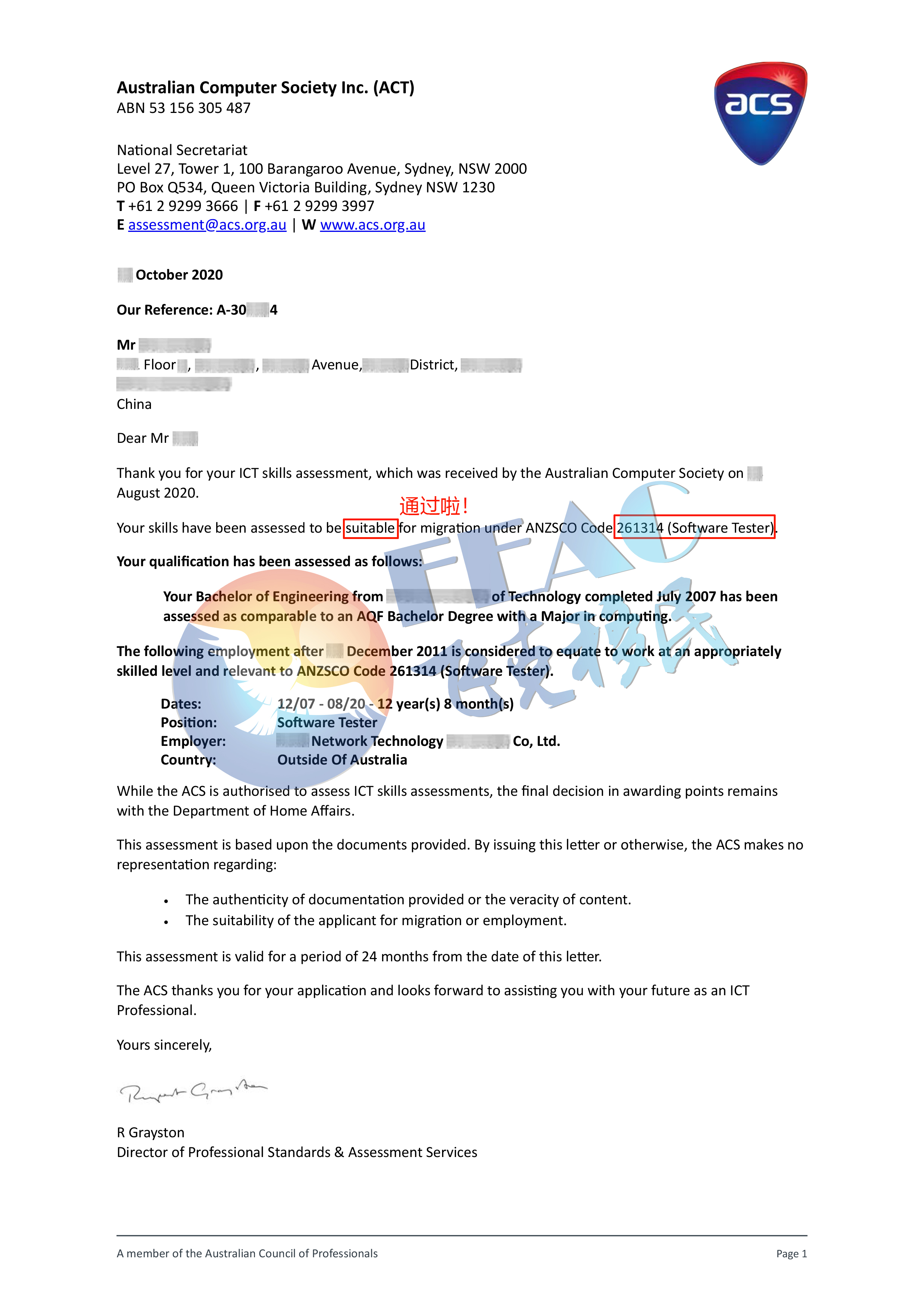 ACS審理改制以來,對于工作材料的要求非常嚴格,很多的申請案例中都出現被要求補料的情況。客戶由于工作年限過長,早些年的材料沒辦法按照ACS的要求提供完全。同時由于ACS的工作年限扣減規則復雜,稍有不慎就可能拿不到工作經驗的滿分。在這種情況下,飛克文案把客戶的學歷、工作材料反復地梳理,最終通過完善簡歷、主動提交cover letter等方式完成提交,使得評估順利通過并拿到工作滿分。此外,文案充分利用已有的經驗,避免過度準備材料,審理過程中也無收到任何補料。