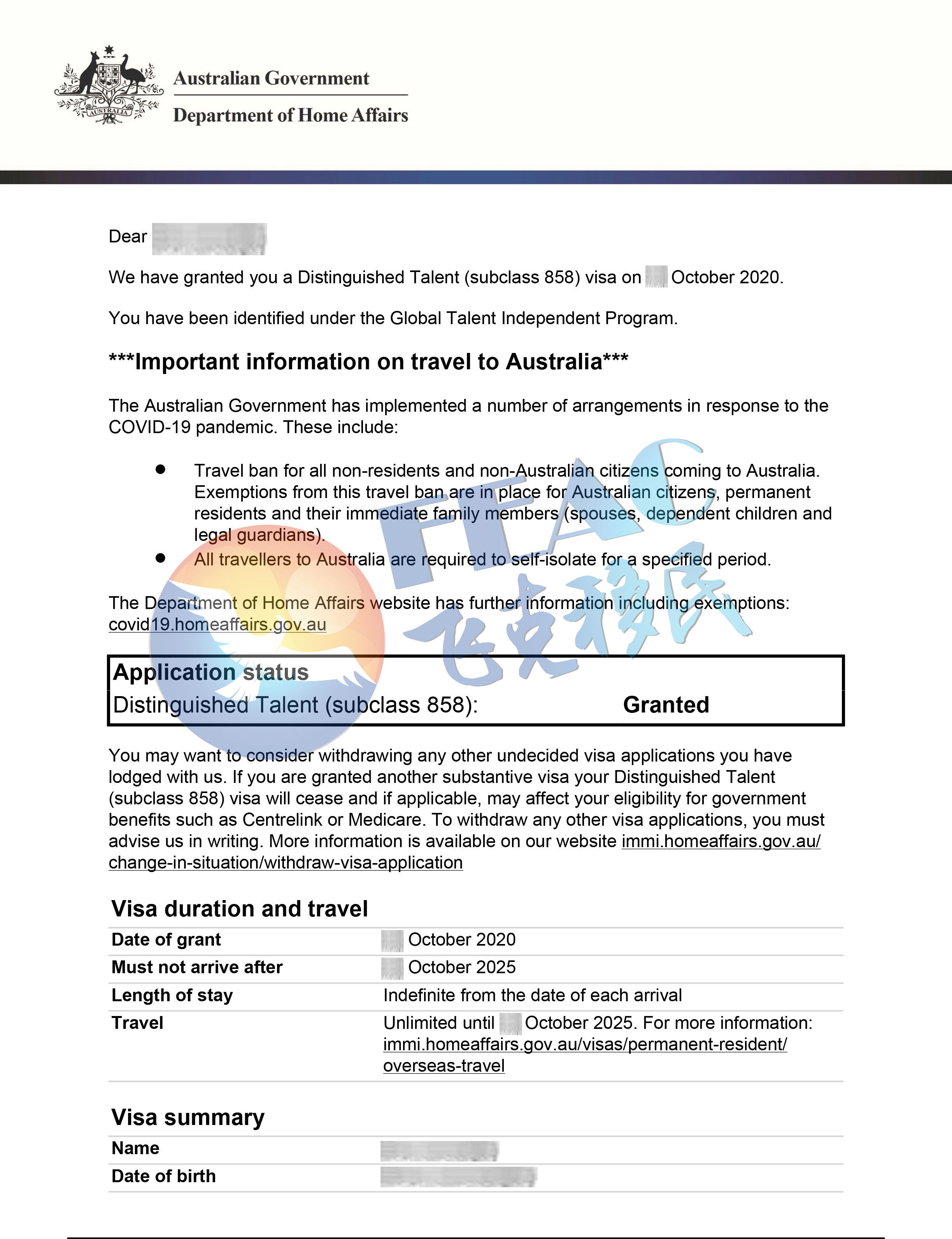 2020年8月27日澳洲境內遞交GTI EOI,2020年9月10日EOI獲邀。2020年9月25日遞交858簽證申請,2020年10月22日858簽證下簽。