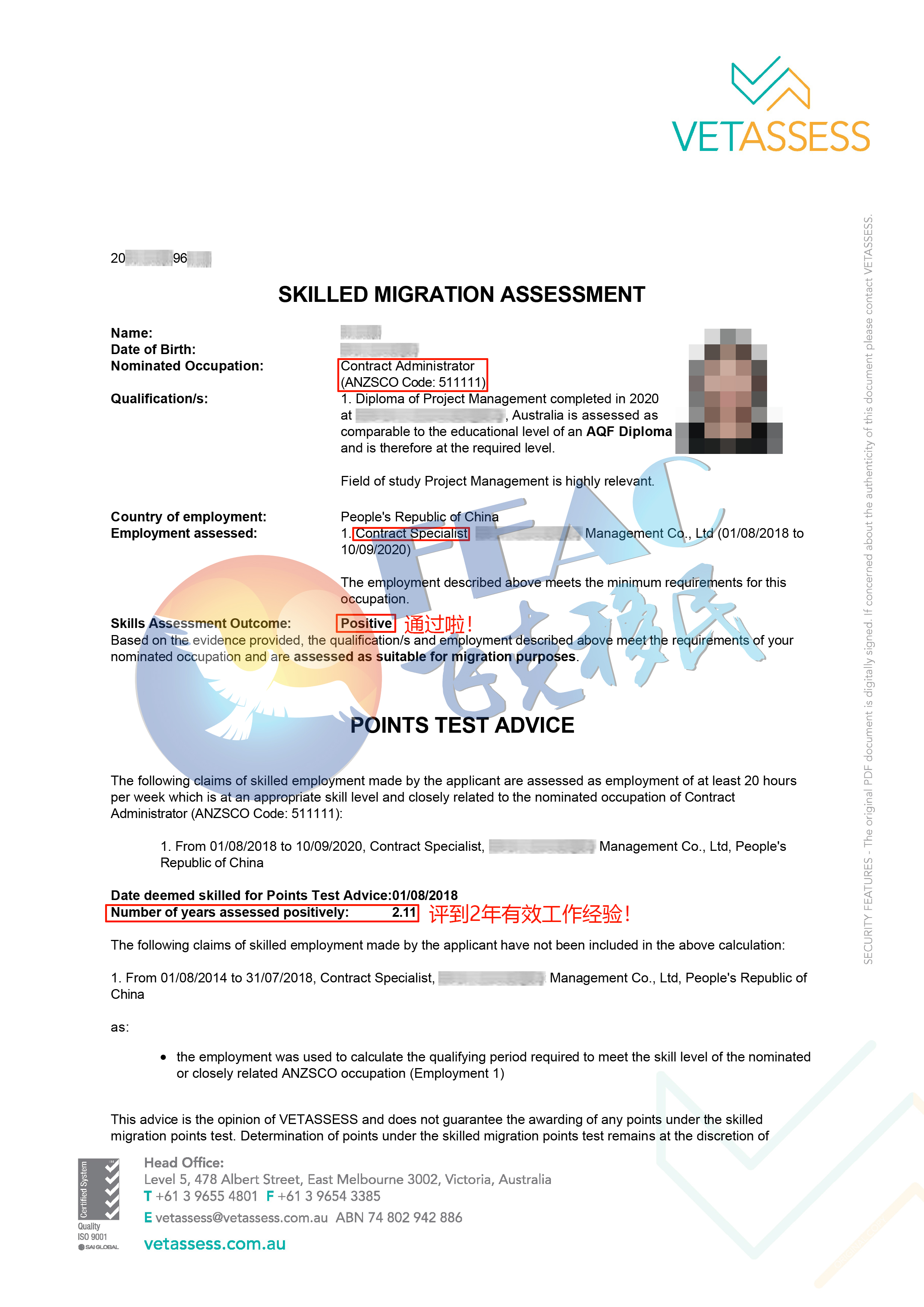 客戶專科畢業時間是2020年6月,學歷前有6年相關工作經驗滿足VET學歷前扣減年限。客戶僅有一段工作經歷,由于客戶公司提供的產品和服務是無形的,涉及合同關系較為復雜,且客戶提供的素材有限。飛克文案基于客戶提供的材料,并結合客戶公司業務范圍及簽訂合同種類進行梳理,精心準備工作材料,豐富推薦信內容,并為客戶做好摸擬電調。最終無電調審理順利通過VET評估,且專科專業被認定為高度相關。