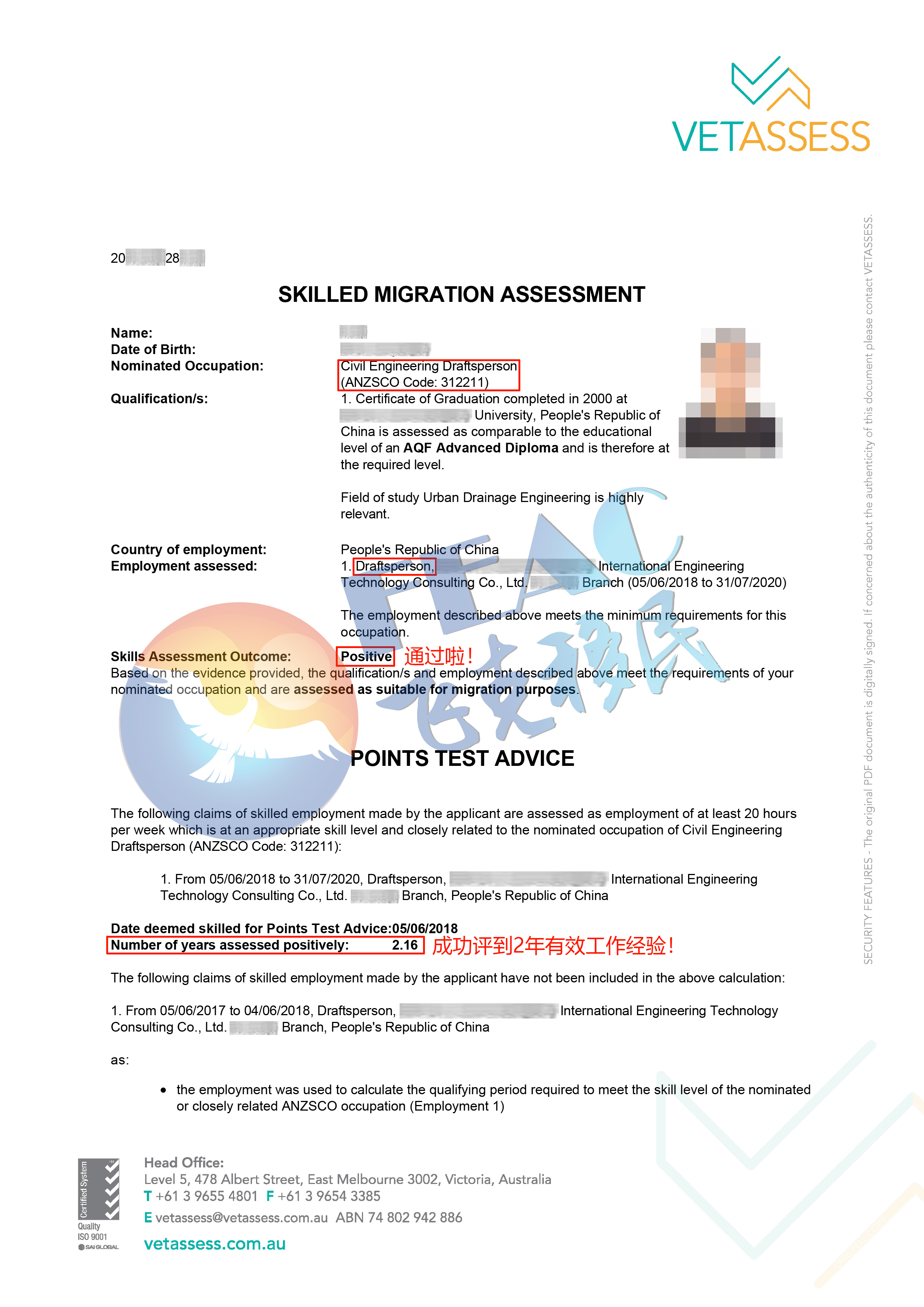 客戶是專科學歷背景,城鎮給排水工程專業,屬于高度相關專業。雖然客戶畢業時間比較久,但直至近5年才有3年土木工程繪圖員相關工作經驗,滿足VET申請要求。起初,客戶提供的素材不符合VET申請要求,但在飛克文案的細心指導下,幫助客戶篩選符合申請的素材并簡化申請材料。同時,對工作材料進行修改并完善,為客戶做好模擬電調。最終客戶無電調順利通過VET評估,且專科專業被認定為高度相關。