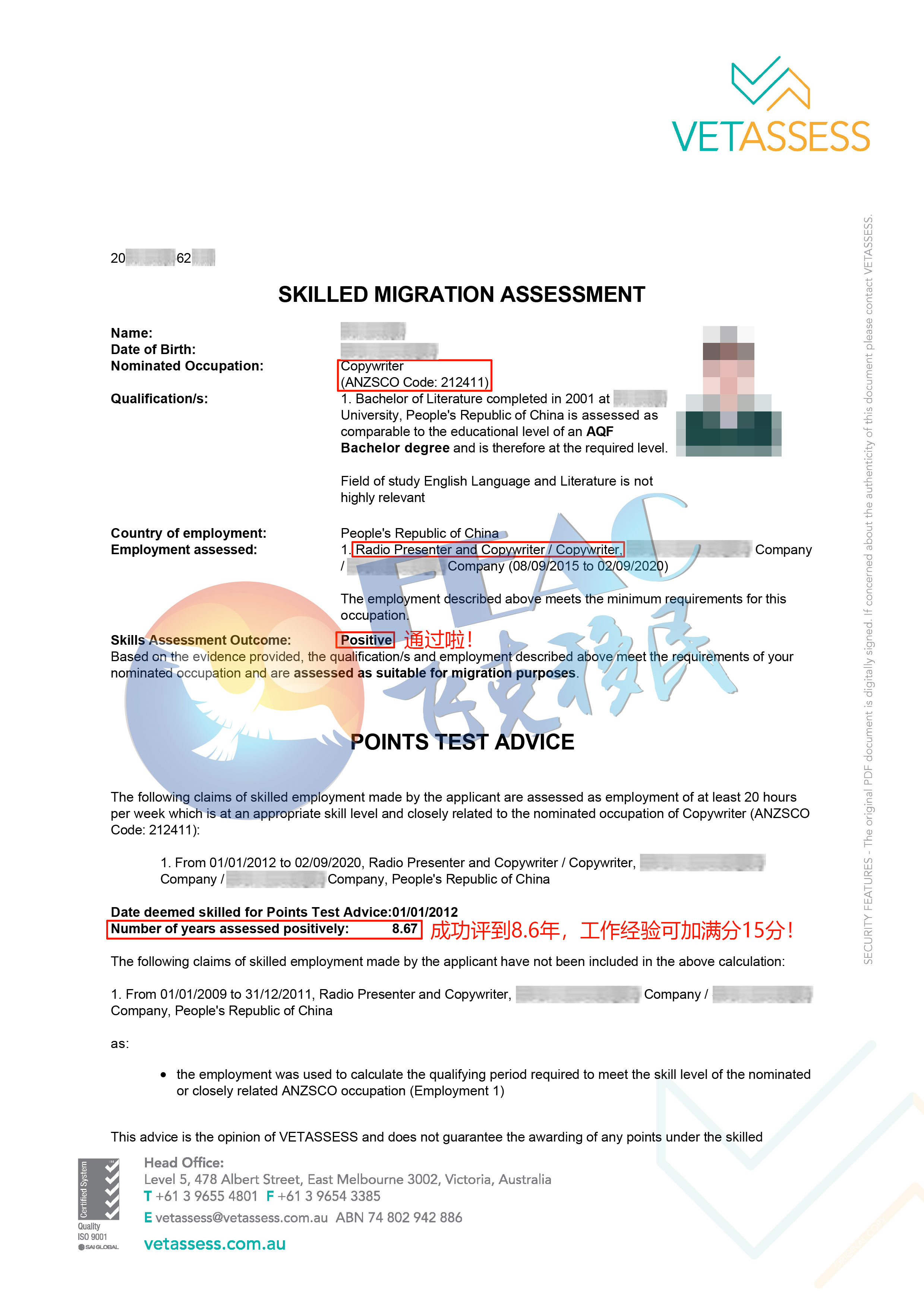 客戶在16年首次做過VET評(píng)估,后由于職業(yè)從職業(yè)清單上被移除,無任何后續(xù)州擔(dān)可走遂調(diào)整移民方案。本次是客戶二次評(píng)估,飛克文案在充分了解客戶首次評(píng)估情況與本次評(píng)估需求后,首先從客戶這些年的工作背景和教育經(jīng)歷出發(fā),仔細(xì)梳理客戶基本情況后,給客戶出具兩個(gè)方案供選擇,并且告知相關(guān)準(zhǔn)備重心與評(píng)估難點(diǎn),與客戶進(jìn)行不斷地溝通與了解,在充分尊重客戶的選擇后,確定以文案作為新職業(yè)進(jìn)行二次評(píng)估,并爭(zhēng)取拿到最大加分年限。