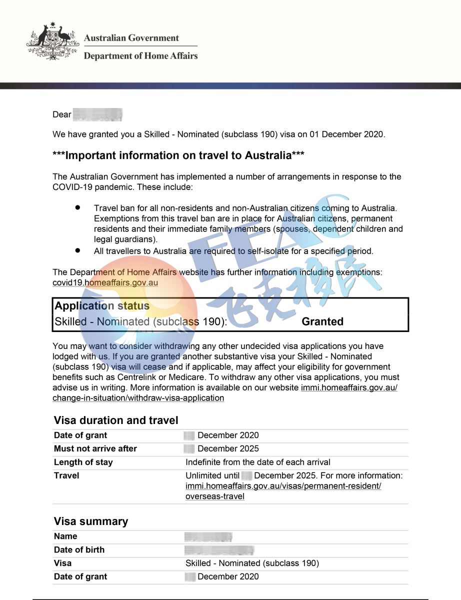 2020年2月10日遞交西澳190擔(dān)保申請(qǐng)(畢業(yè)生類(lèi)別),2020年5月13日獲得西澳190擔(dān)保并EOI獲邀。2020年6月10日澳洲境內(nèi)遞交190簽證申請(qǐng),2020年12月1日190簽證下簽。(移民分80分:EOI基礎(chǔ)分75分+州擔(dān)保5分)