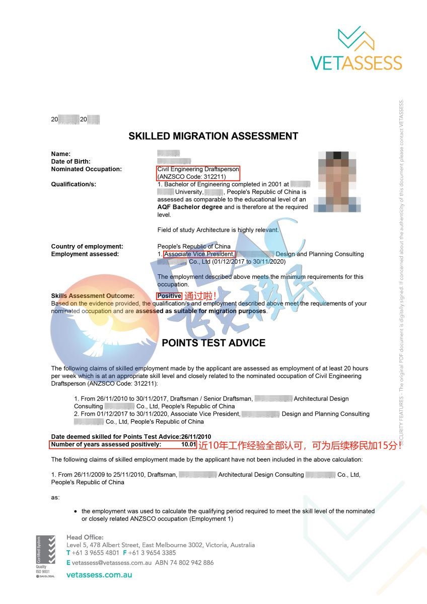 客戶(hù)本科專(zhuān)業(yè)是建筑學(xué),與評(píng)估職業(yè)相關(guān),畢業(yè)后在同一家公司工作10多年,隨著職位由低到高的升遷過(guò)程,其工作內(nèi)容也略有不同。飛克文案以客戶(hù)不同任職期工作內(nèi)容為重點(diǎn),每段工作經(jīng)驗(yàn)職責(zé)分開(kāi)闡述,以符合VET的評(píng)估要求,并基于公司承接的工程項(xiàng)目,從客戶(hù)提供的素材中挑選符合申請(qǐng)的項(xiàng)目案例,分別闡述了項(xiàng)目背景及針對(duì)客戶(hù)在此項(xiàng)目中的工作內(nèi)容做了詳細(xì)描述,準(zhǔn)備完善后遞交,并為客戶(hù)做好了摸擬電調(diào)。客戶(hù)在遞交的時(shí)候選擇了VET加急通道,最終評(píng)估快速通過(guò),本科專(zhuān)業(yè)被認(rèn)定為高度相關(guān),并且如愿拿到了滿分工作經(jīng)驗(yàn)。