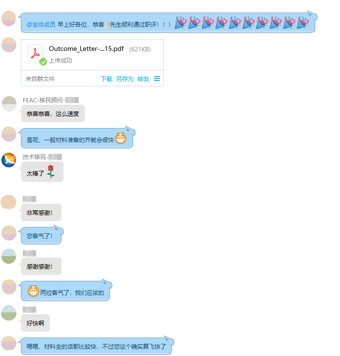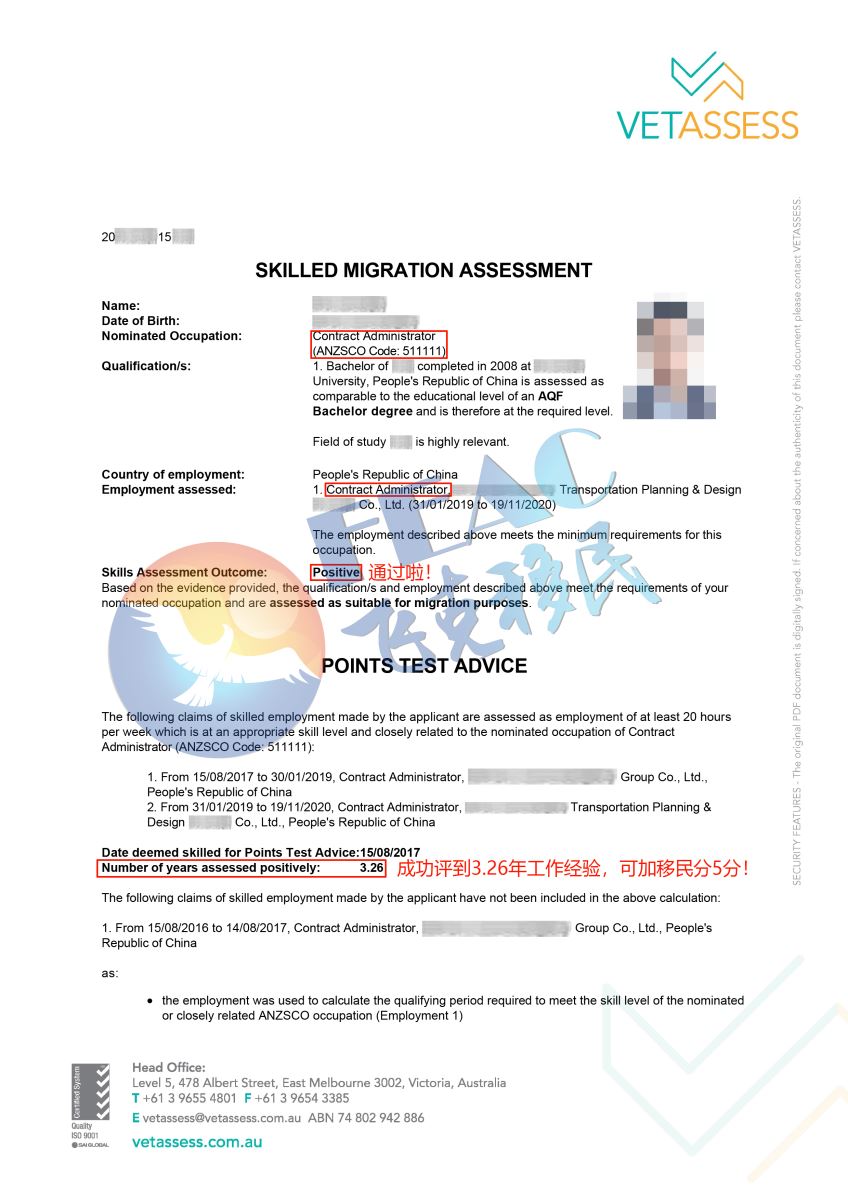 此客戶背景條件非常不錯,專業(yè)與工作經(jīng)驗均與所評職業(yè)高度相關(guān),難點就在于工作材料的準備方面。由于客戶無法提供有效稅單材料,飛克文案便幫客戶準備了多種社保材料作為補充,并撰寫了專業(yè)且詳細的推薦信,提交合同模板等材料。飛克文案多次和客戶溝通材料內(nèi)容與細節(jié),力求完善,客戶在辦理過程中也非常配合,在共同努力之下,最終無補料順利通過評估!