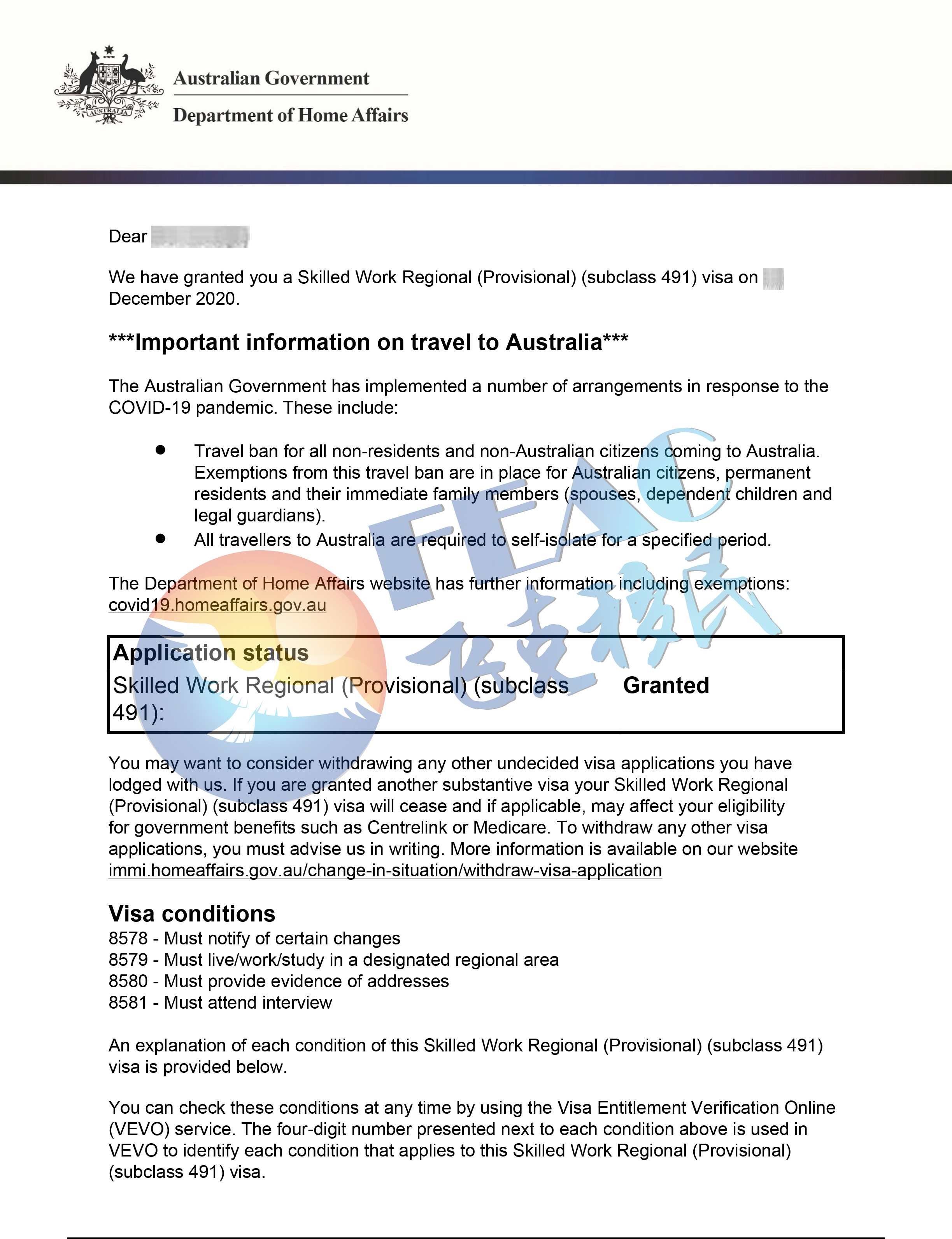 2020年4月27日澳洲境內遞交北領地491擔保申請,2020年9月7日獲得北領地491擔保并EOI獲邀。2020年10月16日澳洲境內遞交491簽證申請,2020年12月9日491簽證下簽。(移民分75分:EOI基礎分60分+州擔保15分)
