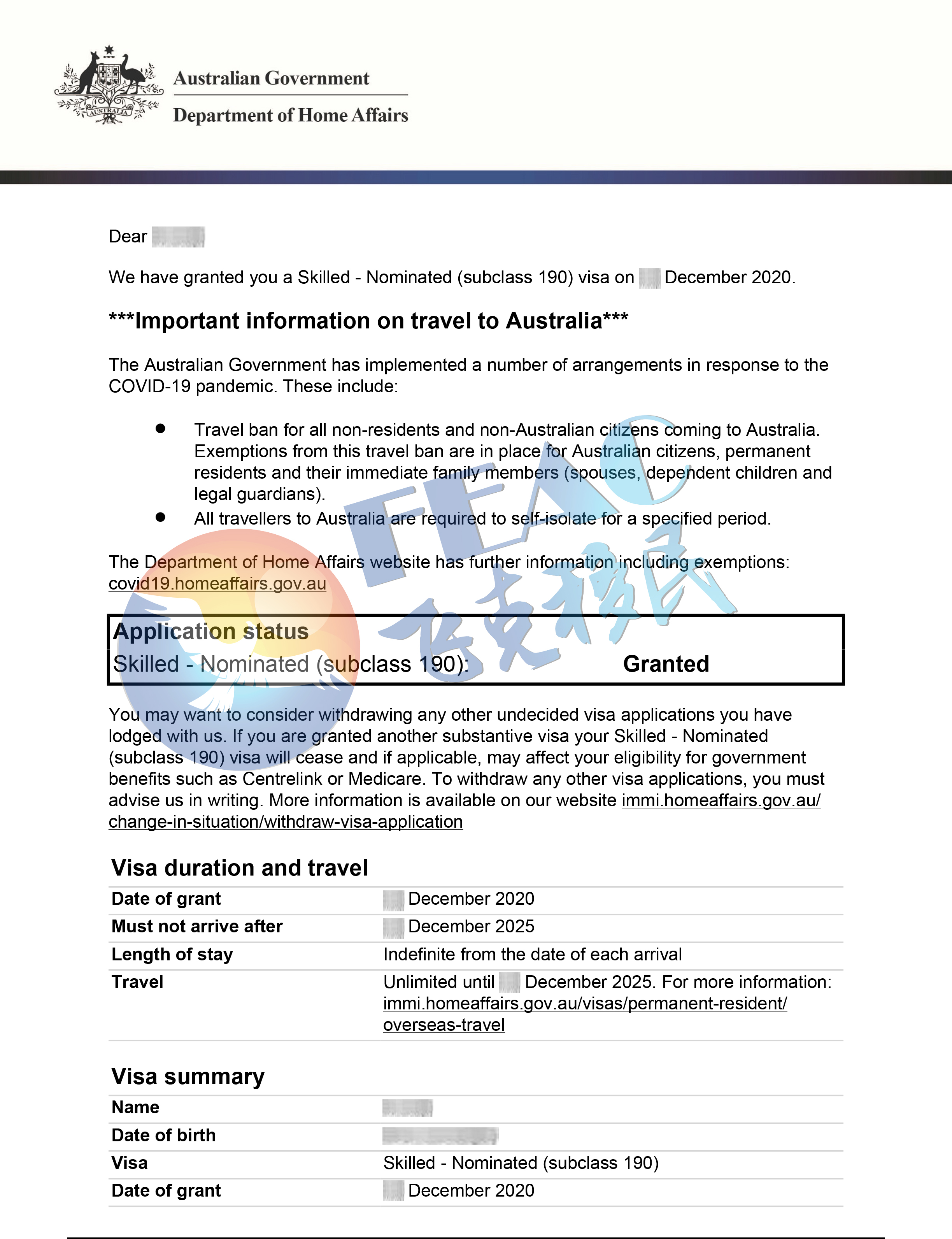 2020年2月10日遞交西澳190擔保申請(畢業生類別),2020年3月31日獲得西澳190擔保并EOI獲邀。2020年4月20日澳洲境內遞交190簽證申請,2020年12月14日190簽證下簽。(移民分90分:EOI基礎分85分+州擔保5分)