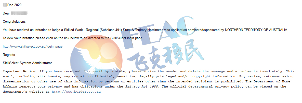 2020年9月25日境內遞交北領地491擔保申請,2020年12月15日獲得北領地491擔保并EOI獲邀。(移民分70分:EOI基礎分55分+州擔保15分)