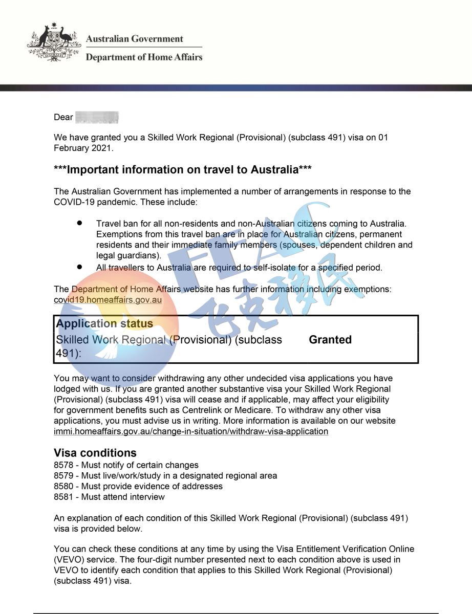 2020年2月28日遞交維州491擔保申請,2020年5月18日獲得維州491擔保并EOI獲邀。2020年6月24日澳洲境外遞交491簽證申請,2021年2月1日491簽證下簽。(移民分70分:EOI基礎分55分+州擔保15分)