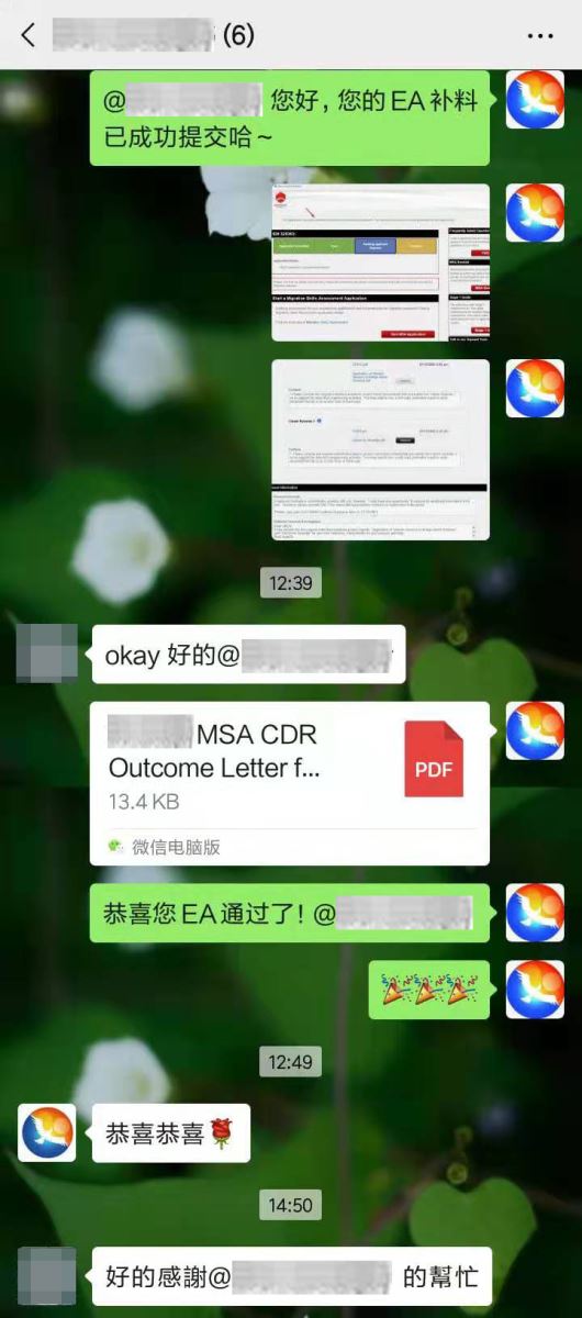 由于客戶提供的CDR兩篇素材是多年前學校設計課程報告,缺少符合EA遞交的一些關鍵步驟,在飛克文案的整理和指導下,客戶按照備注補充了細節和過程。飛克文案還按照EA的要求,幫助客戶將報告中的部分內容進行了適當的修改。遞交申請后,EA要求補料CDR兩篇原文報告,飛克文案及時通知客戶并提交補料內容后迅速通過了評估。