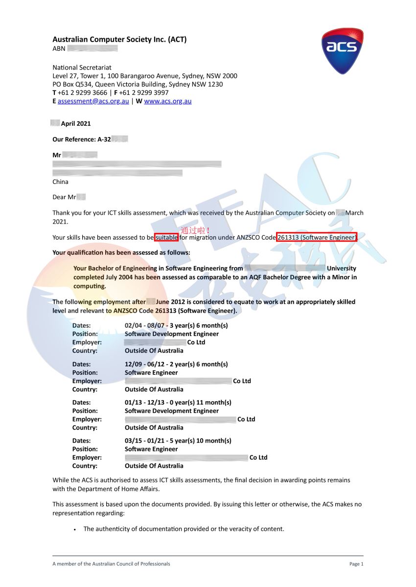 2021年3月4日遞交ACS評估,2021年4月20日通過評估。