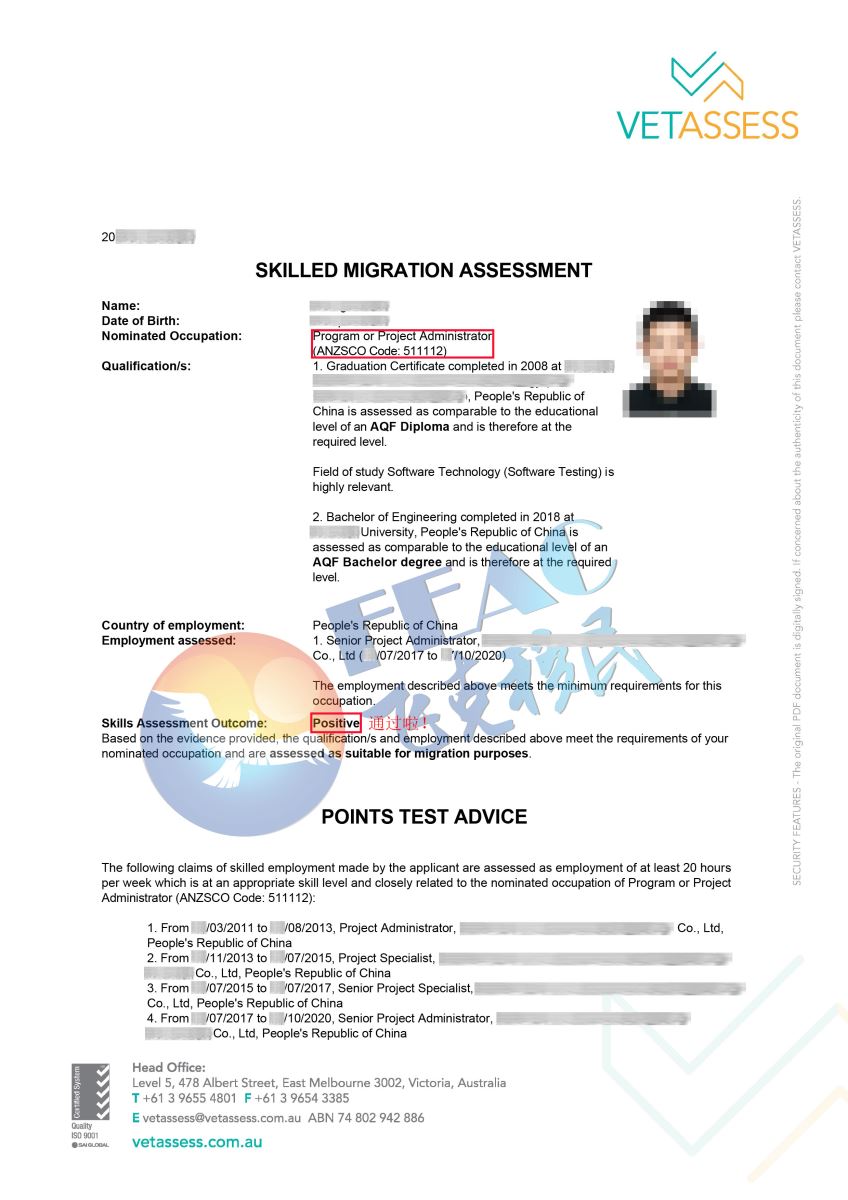 客戶學歷與評估職業(yè)非相關,有四段以上的工作經(jīng)驗,需準備的材料較多。飛克文案根據(jù)VET的評估標準和扣減要求,仔細梳理客戶的工作材料,確定了四家公司后為其精心準備相應的工作證明、推薦信以及簡歷等相關材料,并為客戶準備模擬電調,做好充足的準備。由于客戶公司情況復雜且變更頻繁,遞交后一個月收到VET要求補料的郵件。飛克文案反應迅速,立刻提供了相應的材料證明,撰寫解釋信。最終無電調順利通過,評到了9.46年的工作時長,可加移民分滿分15分!