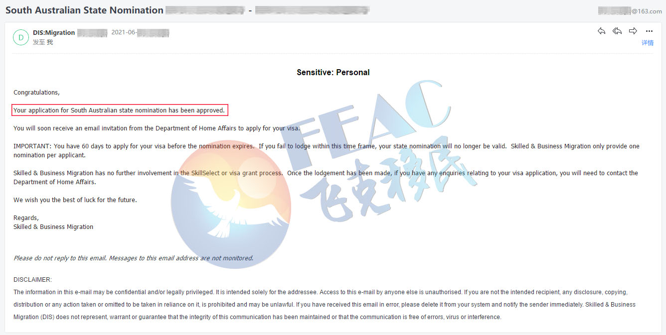 2021年4月21日境內遞交南澳491擔保申請,2021年6月8日獲得南澳491擔保。(移民分70分:EOI基礎分55分+州