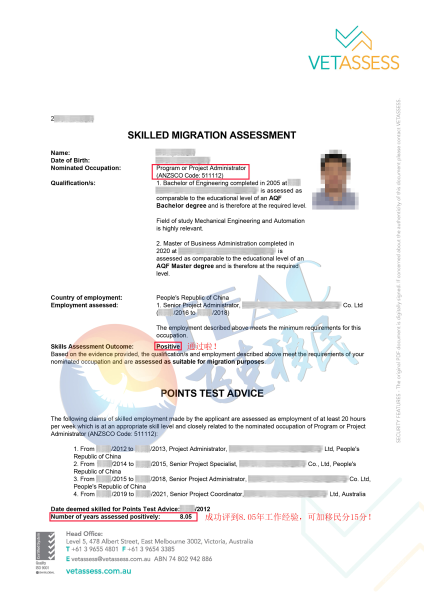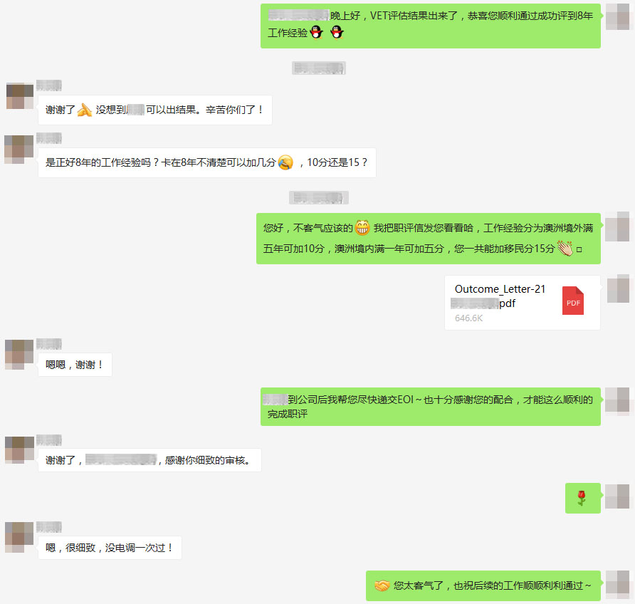 客戶學歷與評估職業非相關,飛克文案在仔細梳理客戶的工作材料后把材料重心放在推薦信上,根據VET對項目管理員該職業的評估要求,結合客戶實際工作背景為其撰寫推薦信。期間客戶也高度配合,在飛克文案的指導下及時提供各種所需材料,整個申請過程十分順利。最終無電調成功通過,并且評到了8.05年的工作時長,幫客戶拿到15分的工作經驗加分。
