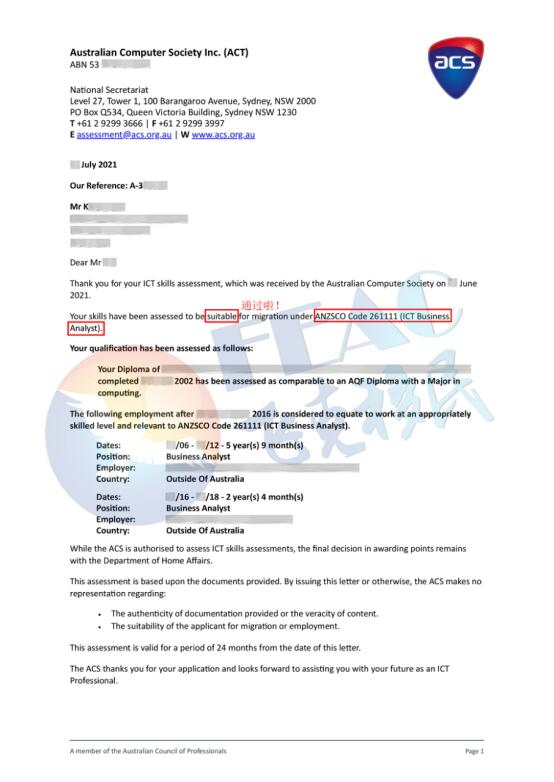 目前ACS對于工作證明材料的要求較高,該客戶在準備過程中,材料的準備和撰寫都有難點。客戶為某專科IT學歷,畢業后在多家單位工作,文案幫助客戶篩選出相關工作經歷段,并加以整理,同時文案幫助客戶規整出符合ACS要求的工資憑證,最終幫助客戶順利通過評估。