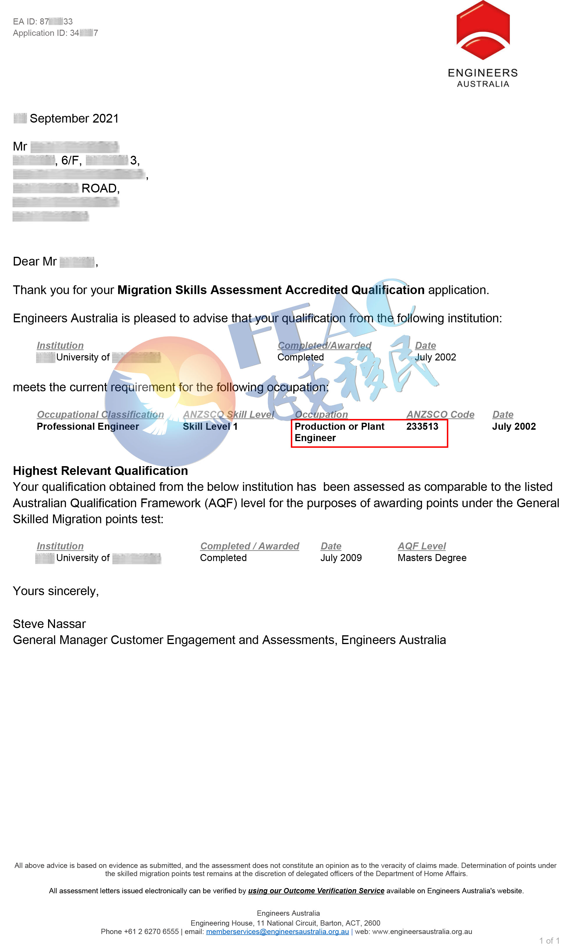 申請職業:Production or Plant Engineer(生產或工廠工程師) ANZSCO 233513;
