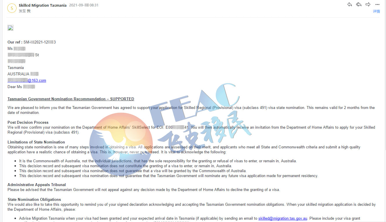 2021年2月18日遞交塔州491擔保申請(畢業生類別),2021年9月16日獲得塔州491擔保并EOI獲邀。(移民分95分:EOI基礎分80分+州擔保15分)