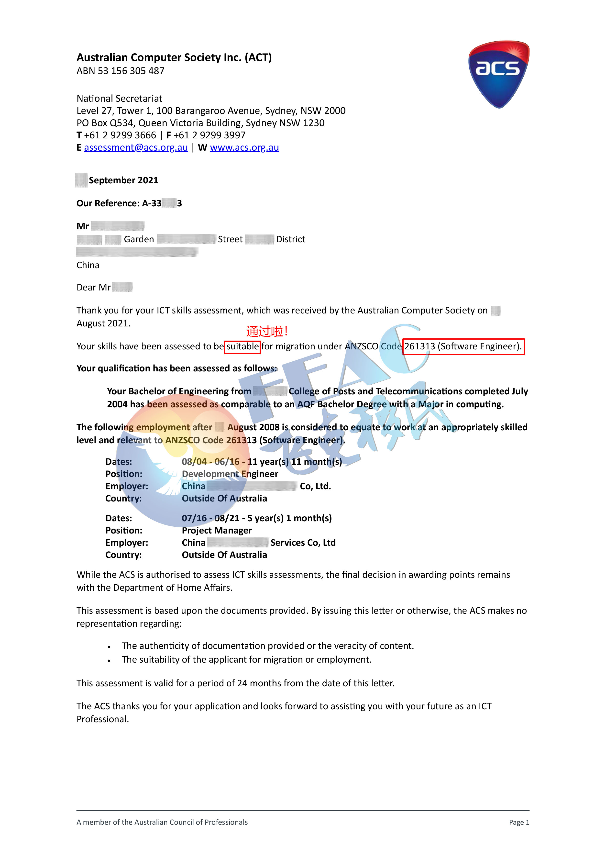 9月20日:恭喜Mr.Cao成功更新ACS通過信(軟件工程師)!