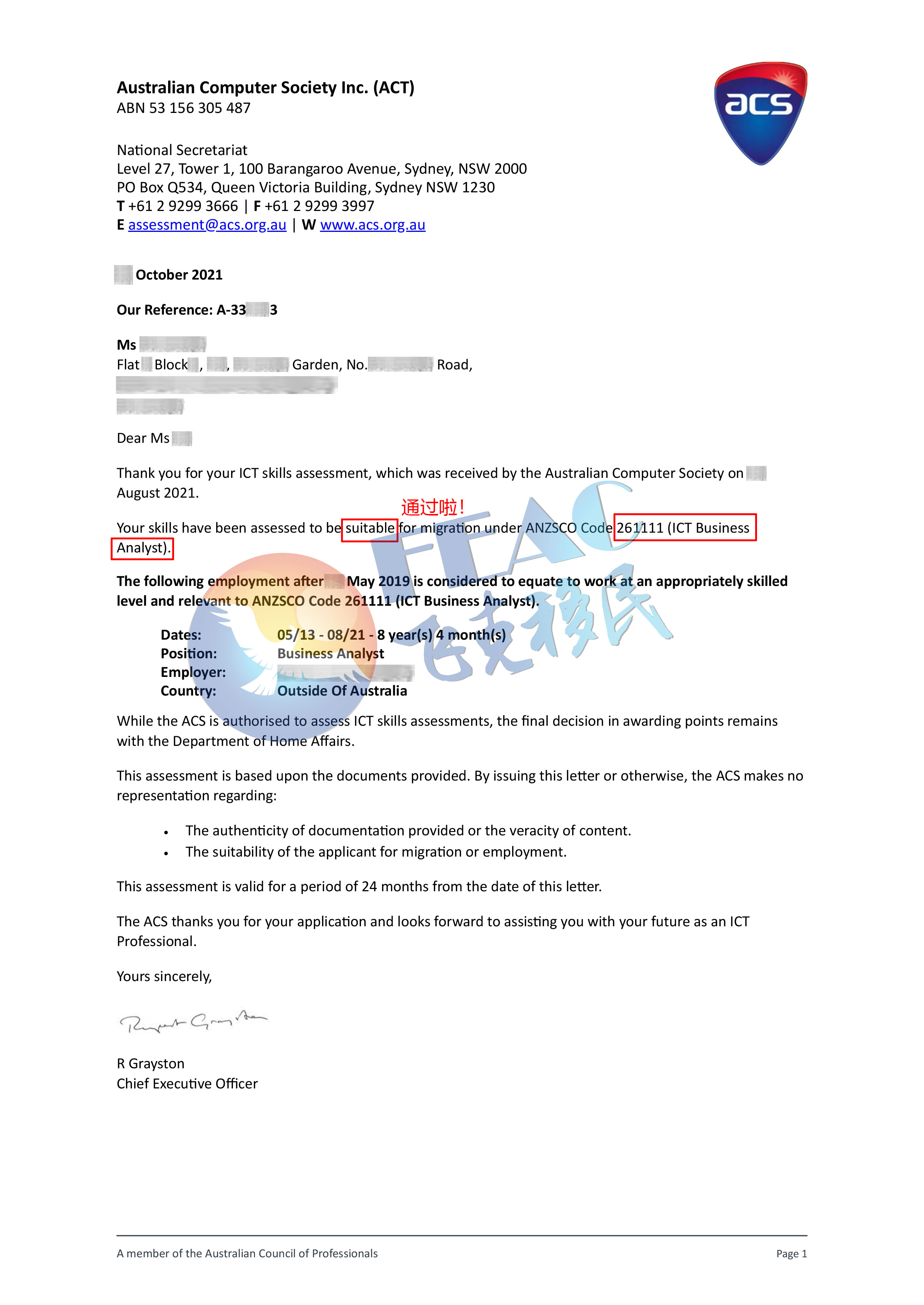 申請職業:ICT Business Analyst (ICT業務分析師) ANZSCO 261111;