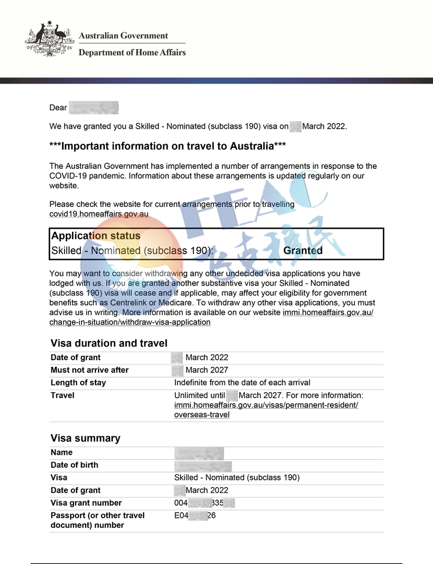 2021年7月19日獲得維州190擔(dān)保并EOI獲邀,2021年7月28日澳洲境內(nèi)遞交190簽證申請,2022年3月4日190簽證下簽(移民分:90分)。