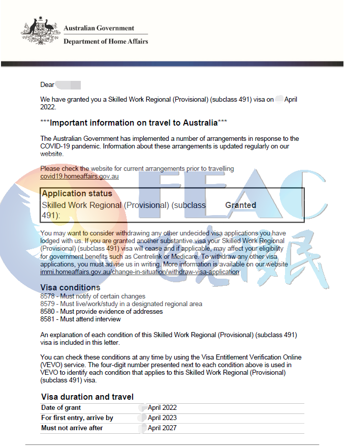 恭喜Mr. Xu 澳洲境外491簽證下簽!