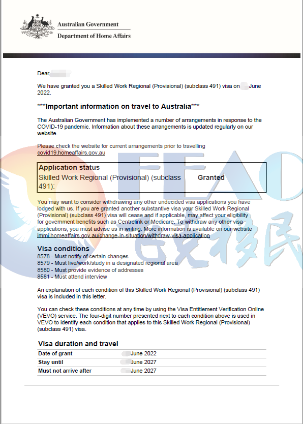 2021年10月8日澳洲境內(nèi)遞交491簽證申請(qǐng),2022年6月24日491簽證下簽。(移民分95分:EOI基礎(chǔ)分80分+州擔(dān)保15分)