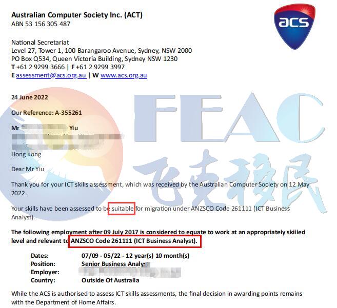 申請職業:ANZSCO Code 261111 (ICT Business Analyst);