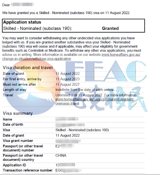 8月11日:恭喜Mr.?Deng?維州190簽證申請獲批!(境外)