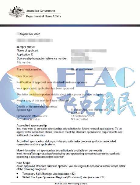 申請情況:2022年5月30日遞交雇主standard business sponsor申請,2022年8月10日收到移民局補料,在文案和雇主的溝通和高度配合下完成補料文件說明,最終于2022年9月12日通過standard business sponsor申請。