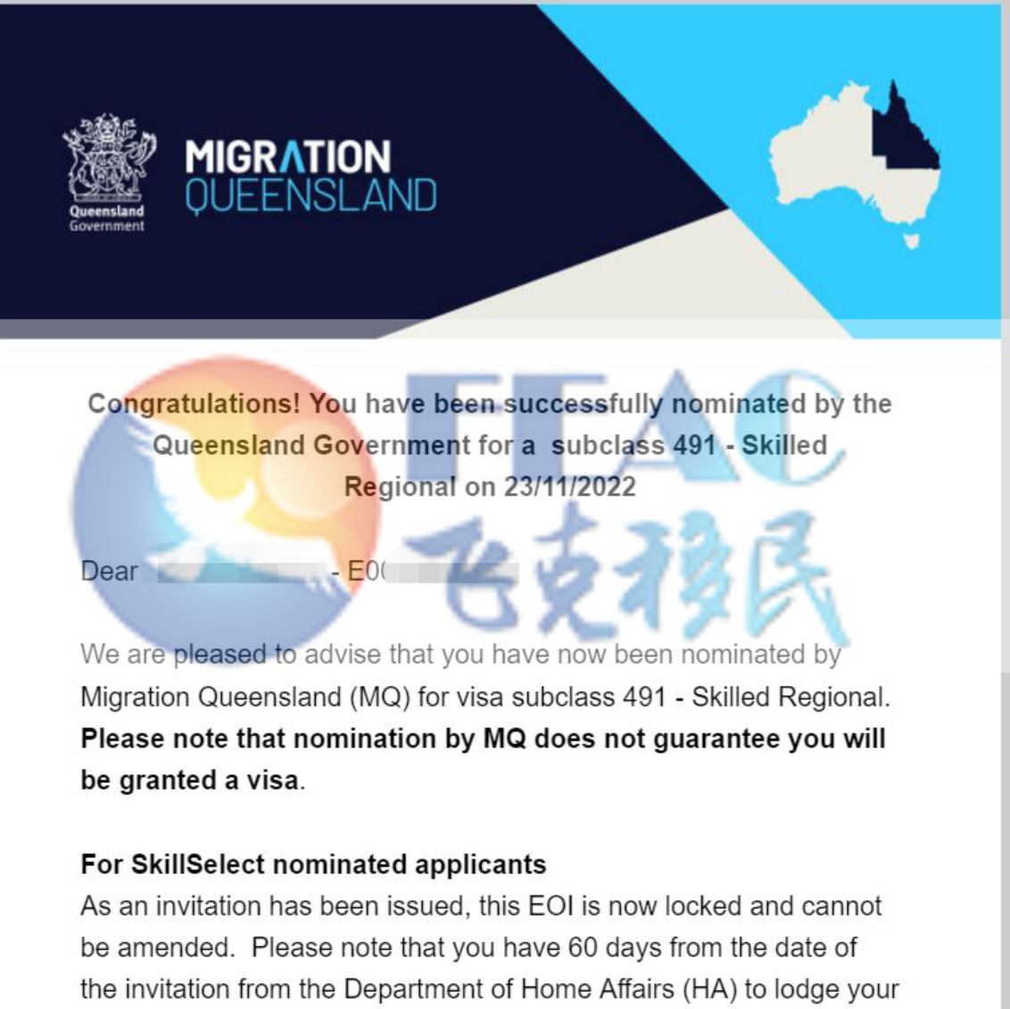 客戶2022.08.16遞交EOI,2022.11.16預獲邀,獲邀分數80分。2022.11.22遞交州擔保申請,2022.11.23正式獲邀。