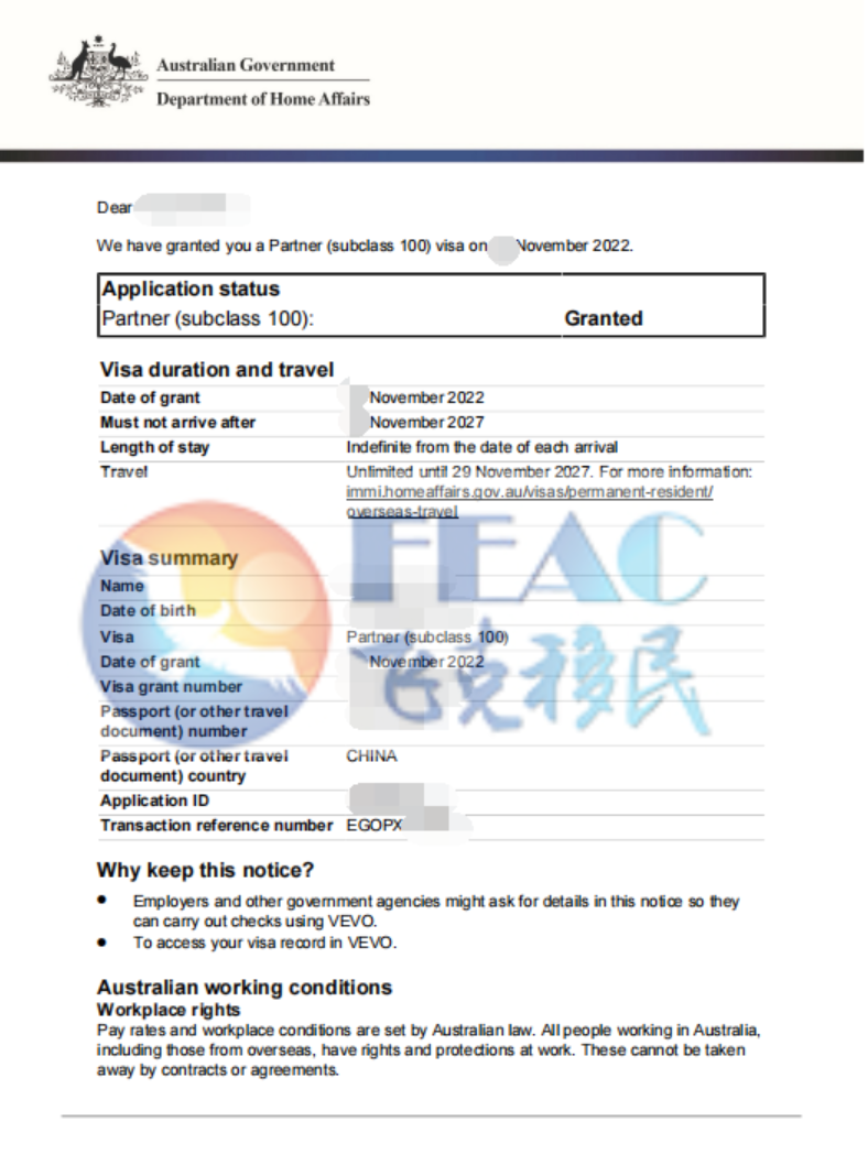客戶于2020.6.15境外遞交309配偶簽,期間經歷8次補料,在文案的耐心指導和材料準備后,最終于2022.11.28順利下簽且直接轉為100永居簽證。