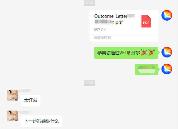 2022年11月19日加急遞交VET評估材料,2022年12月7日通過評估。