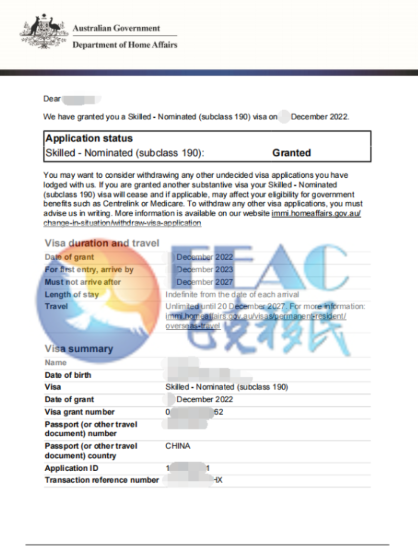 客戶2020.1.10遞交,由于疫情期間澳洲基本上不審理境外的技術移民,澳洲開放給海外申請人之后移民局通知補資料,2022.10.20補料后于2022.12.20順利下簽。