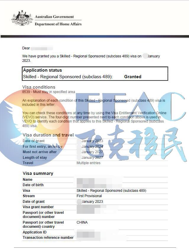1月17日:恭喜Ms. Wang ?南澳489簽證下簽!